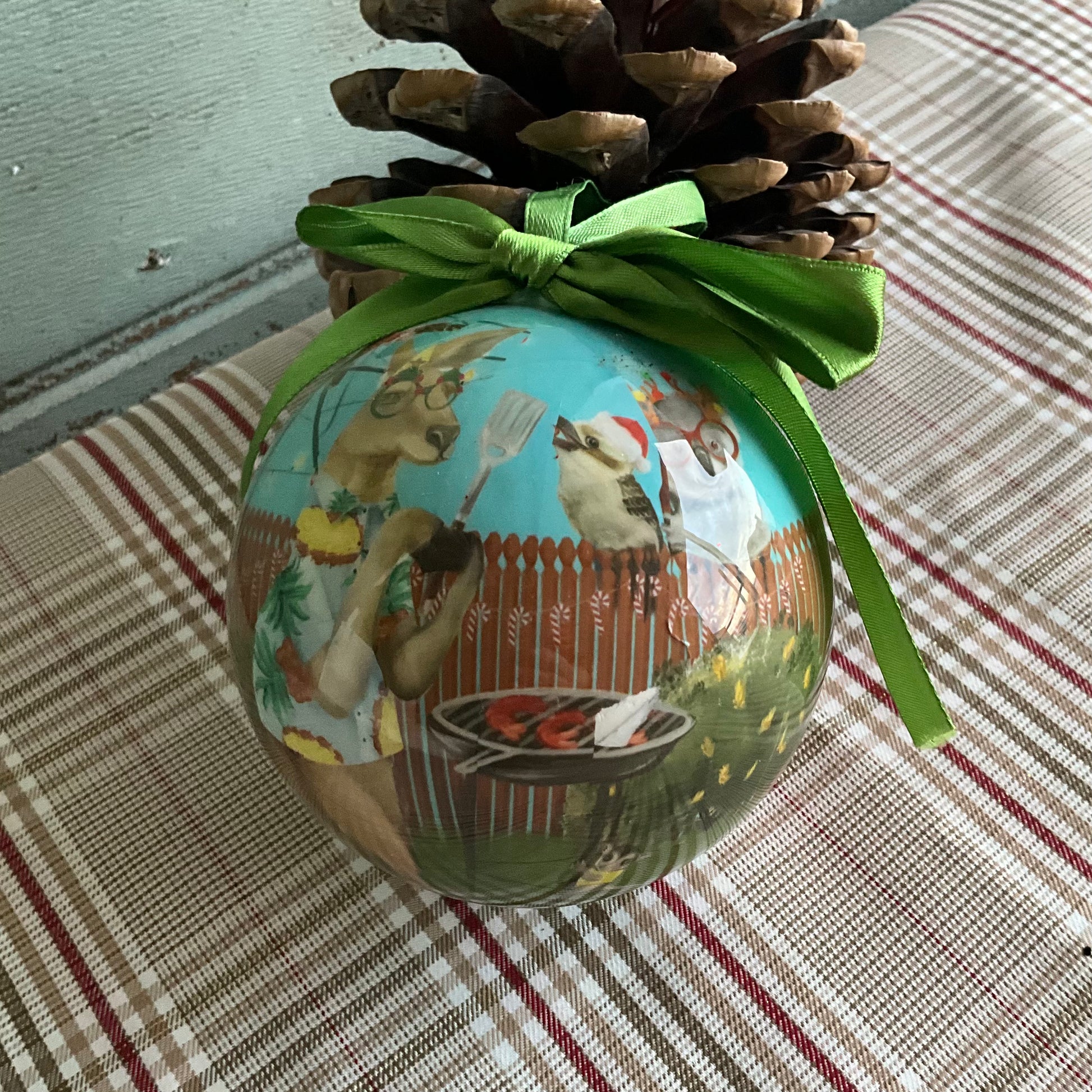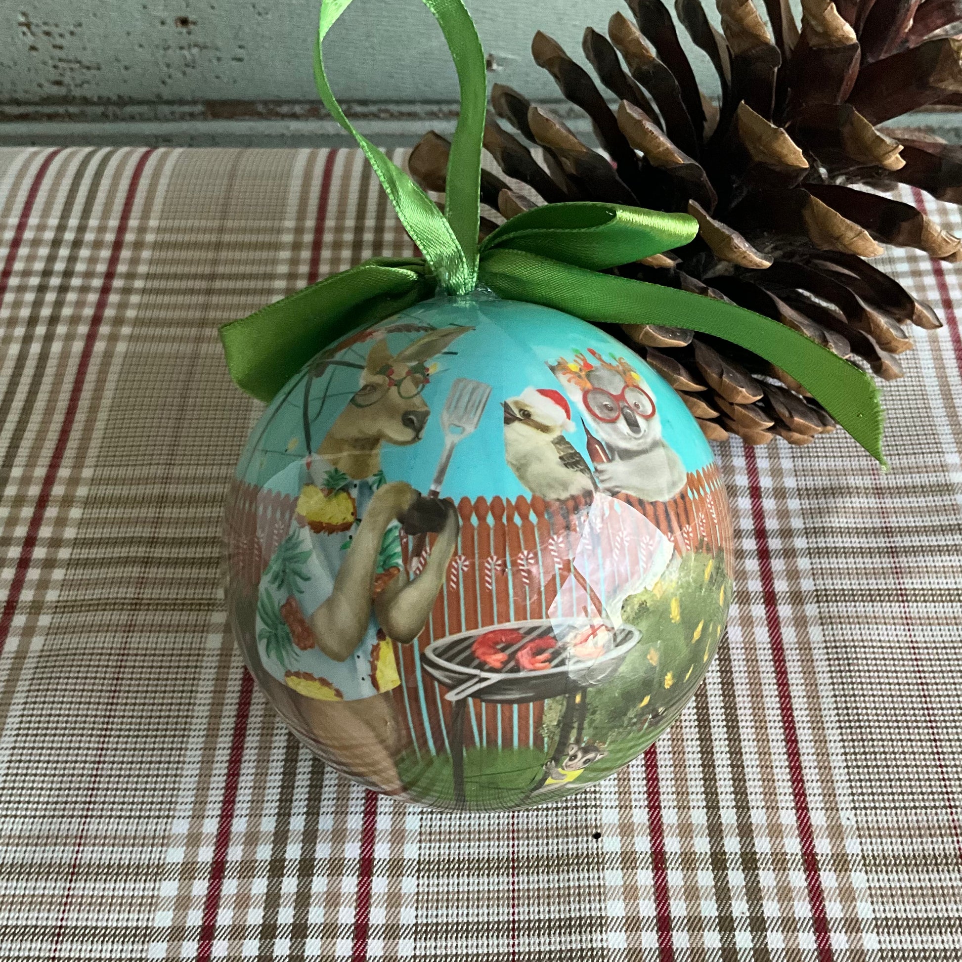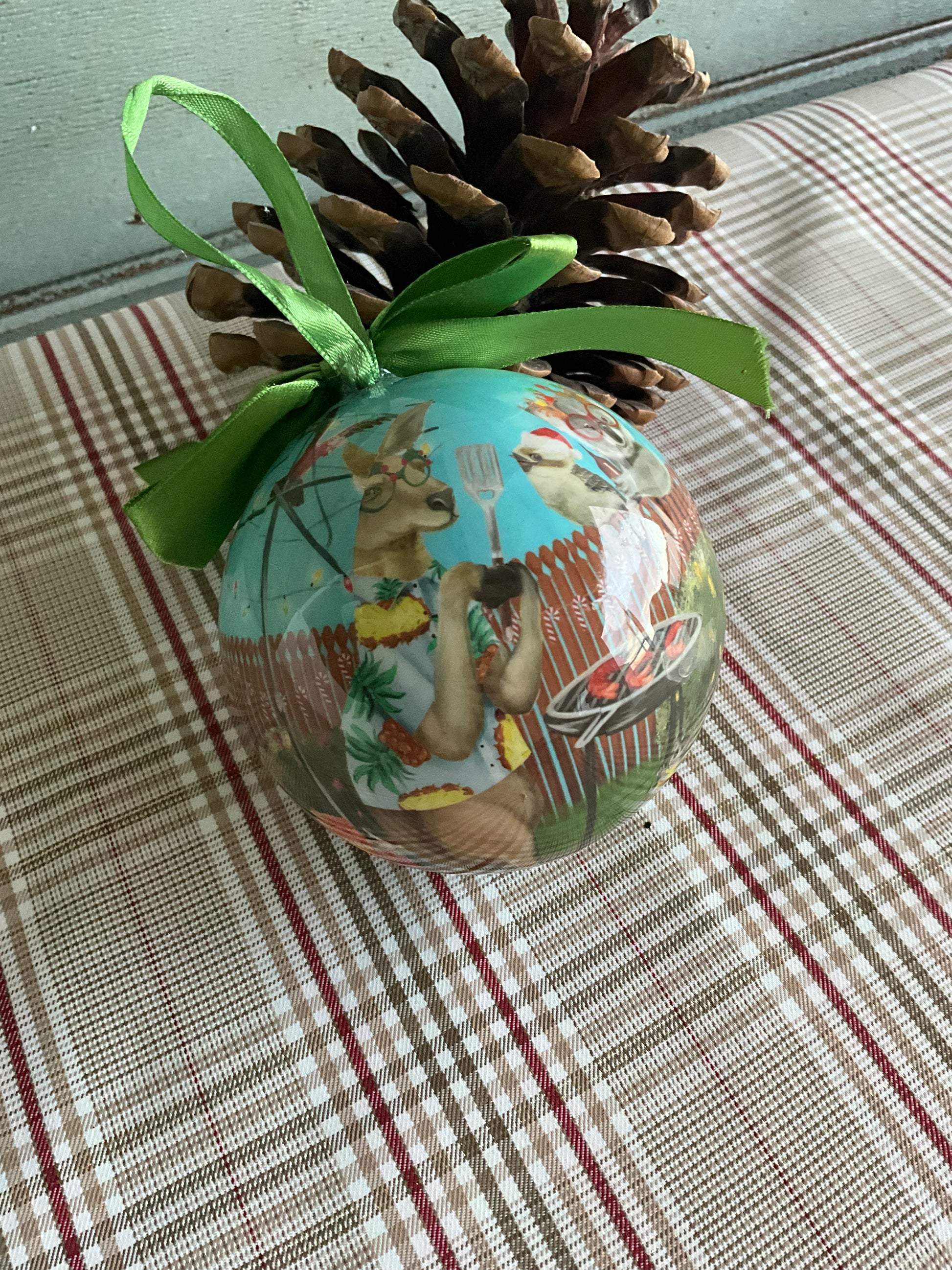 Aussie Christmas ball with a kangaroo. Colourful and paper mache.