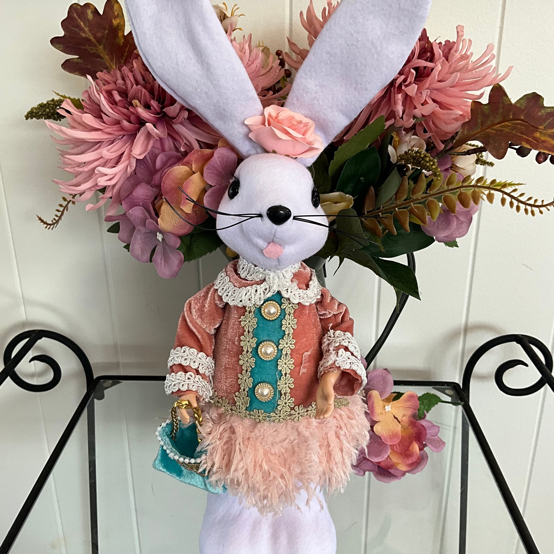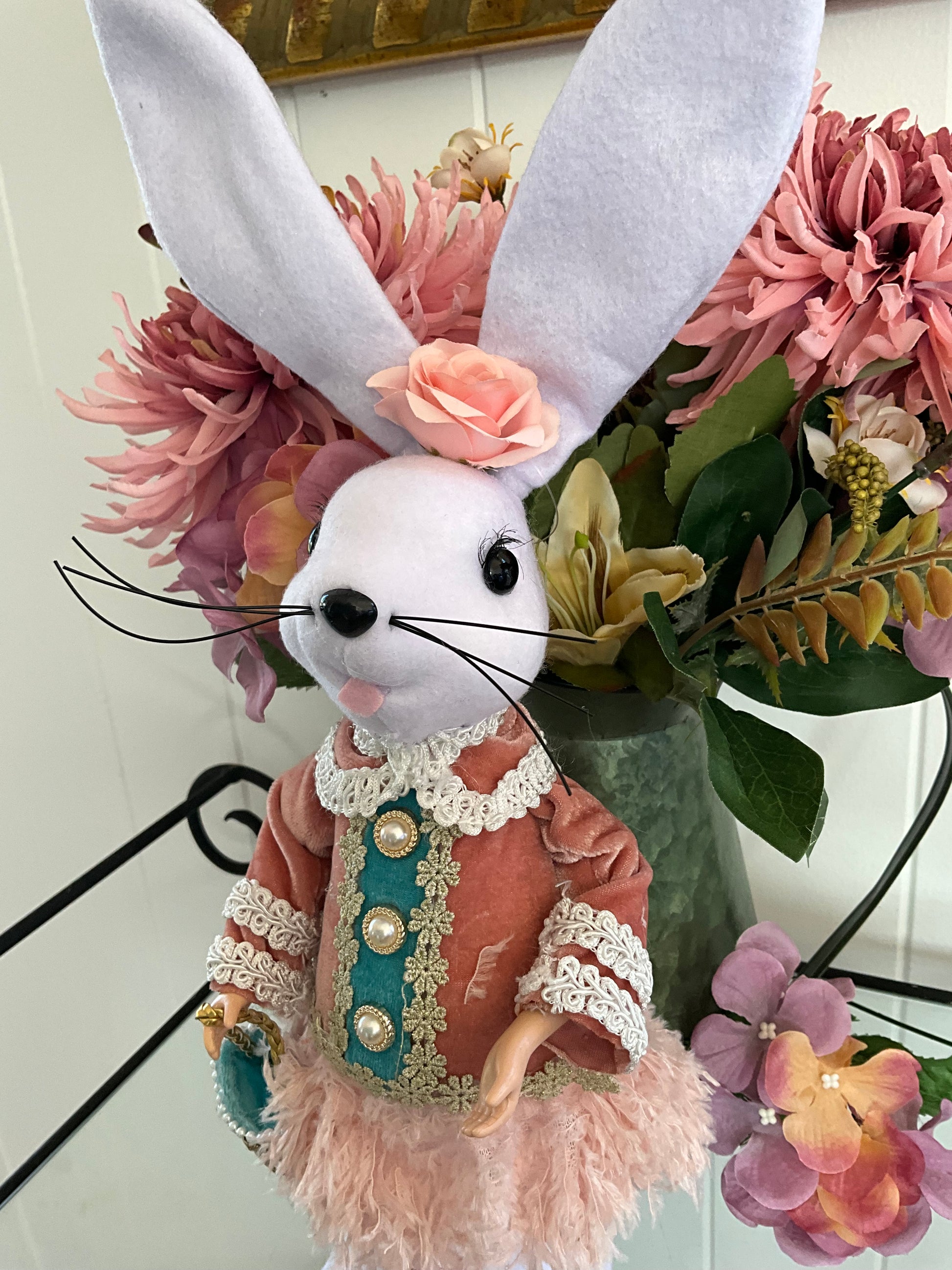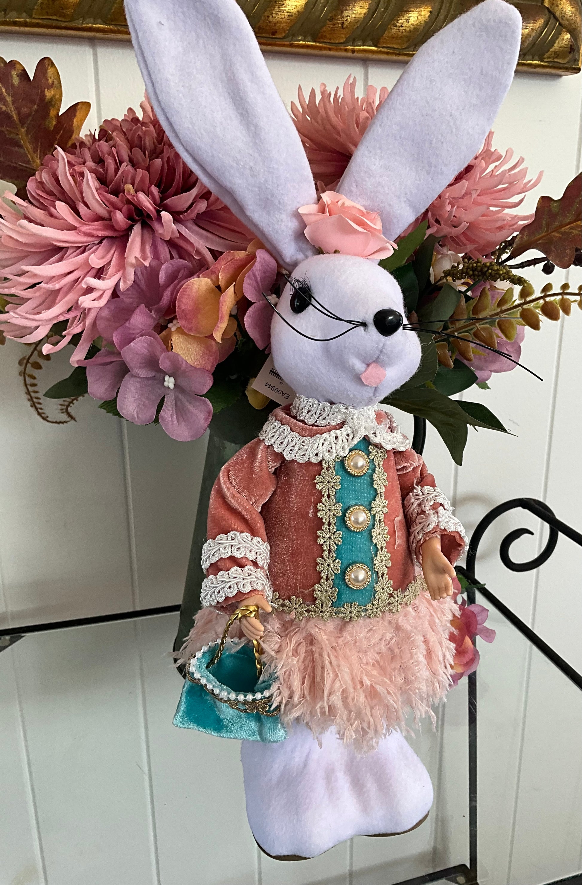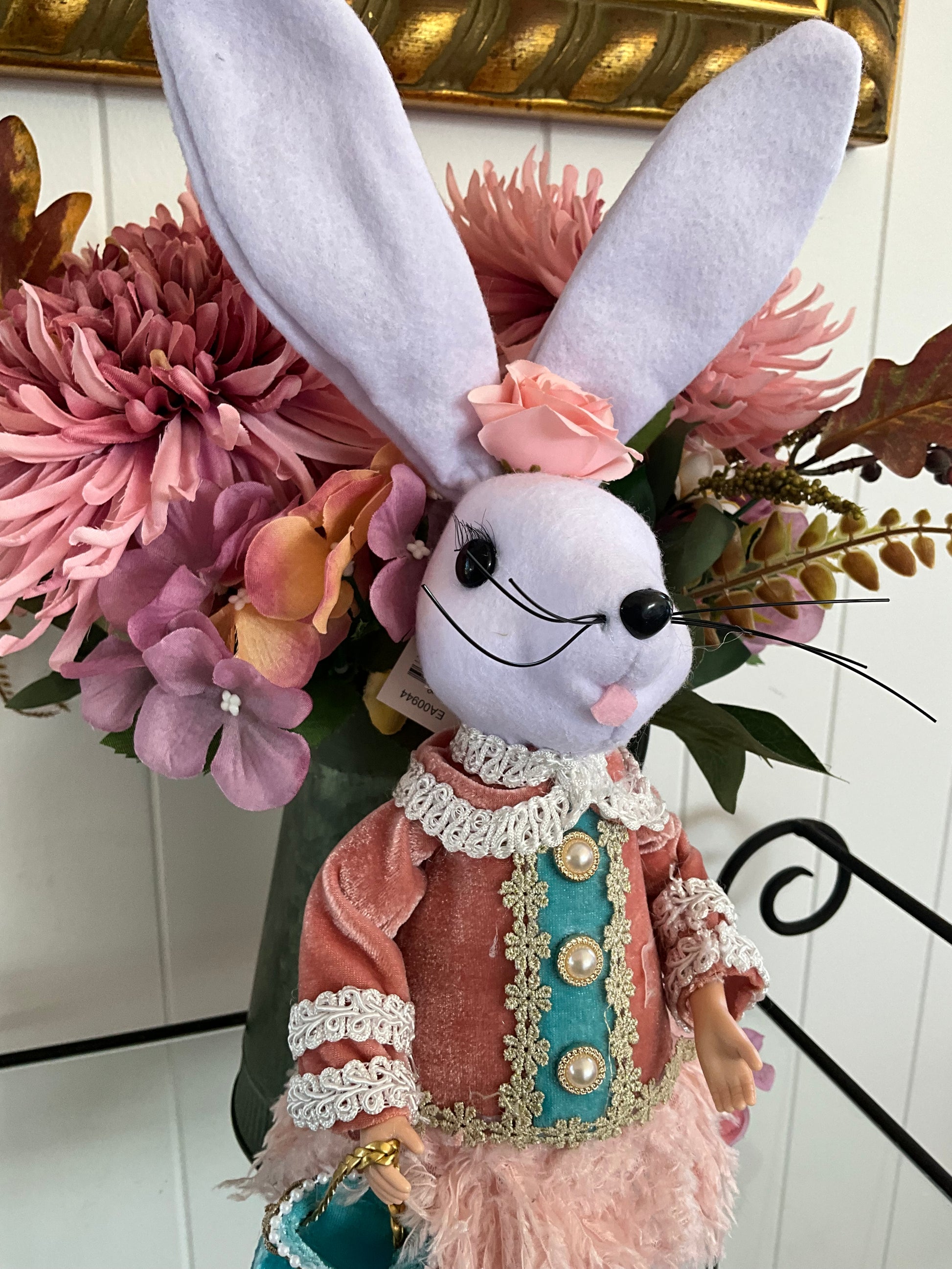 Cute ballerina white Easter bunny in a pink tutu and pink velvet jacket with pearl buttons. Holds a little bag and has big white ears.