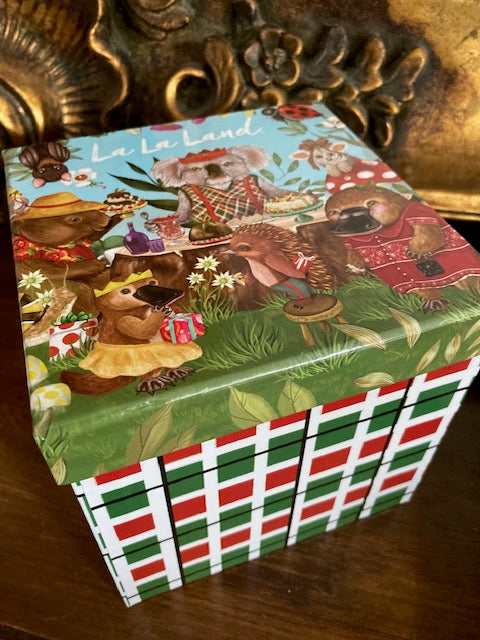 Fun Aussie Christmas bauble featuring a koala, possum, koala, wombat and more. Shiny paper mache with large red velvet bow. Gift Boxed. Light weight for over seas postage. Dimension: 12cm