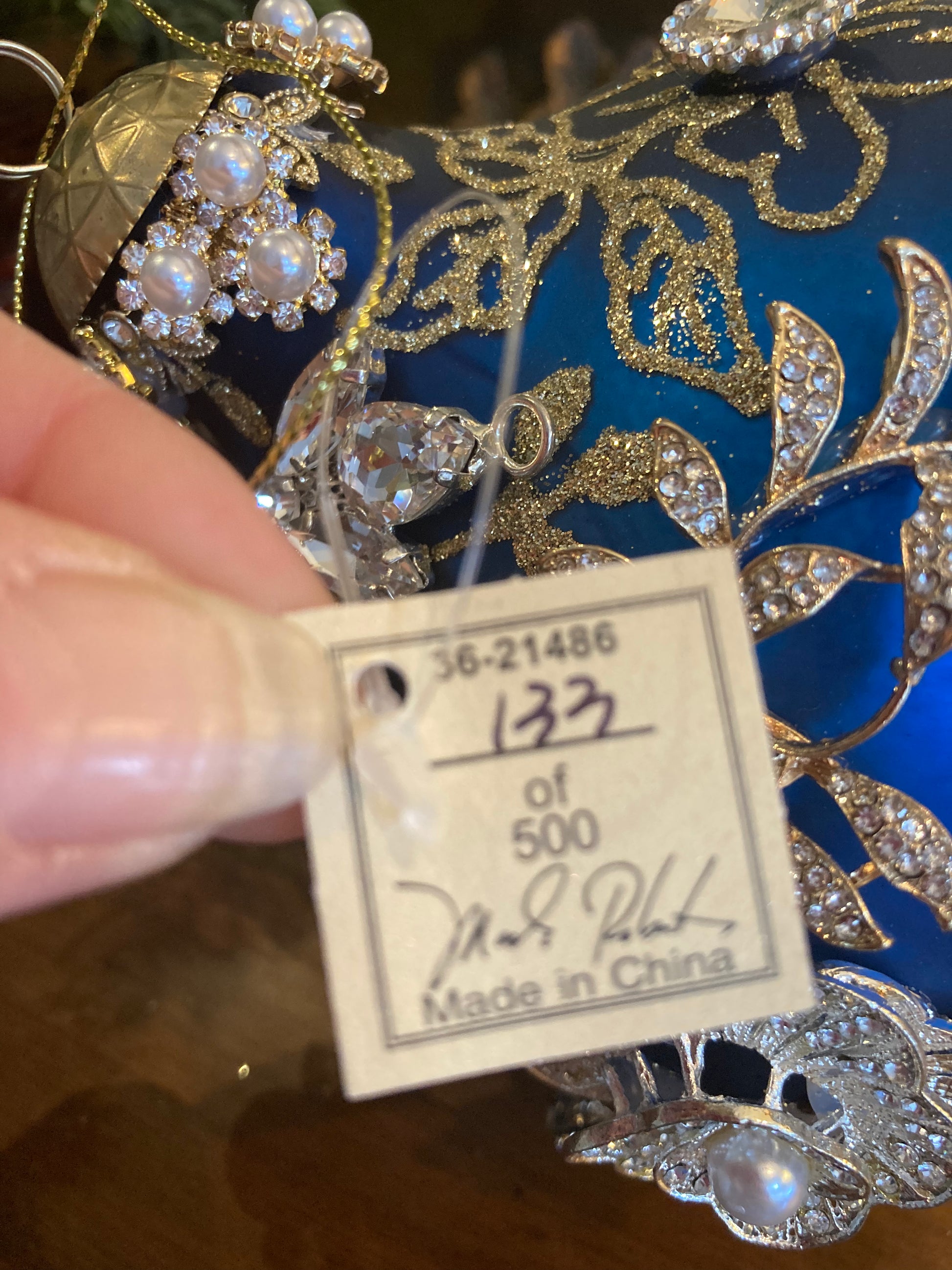 Exquisite blue and jewelled glass drop decoration by designer Mark Roberts. Dimension: 20cm