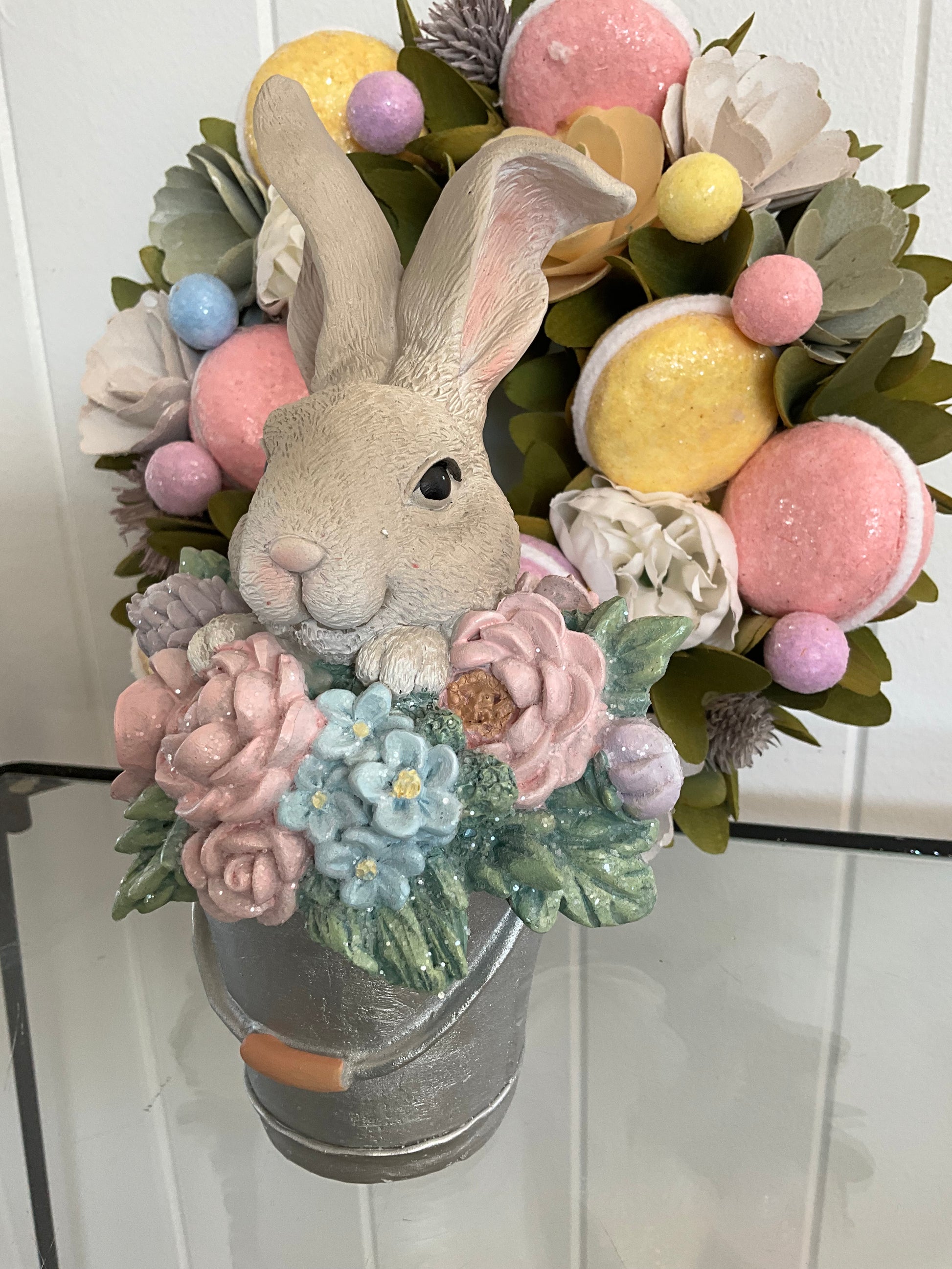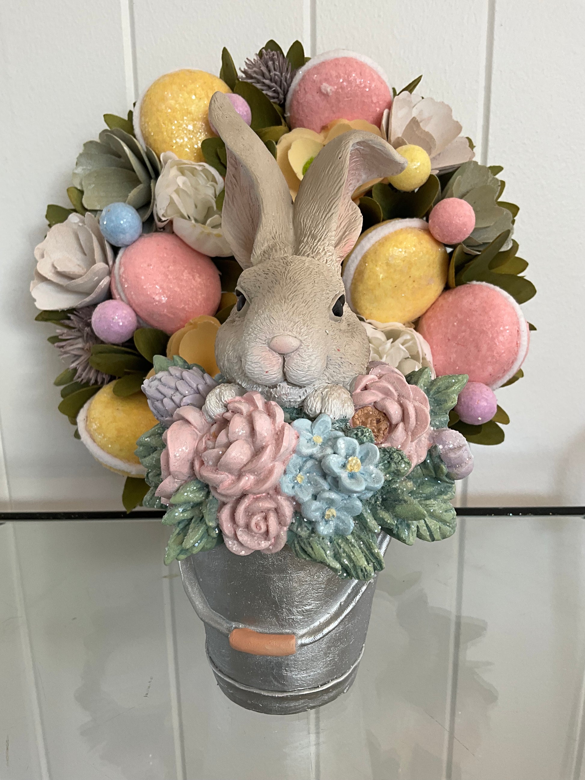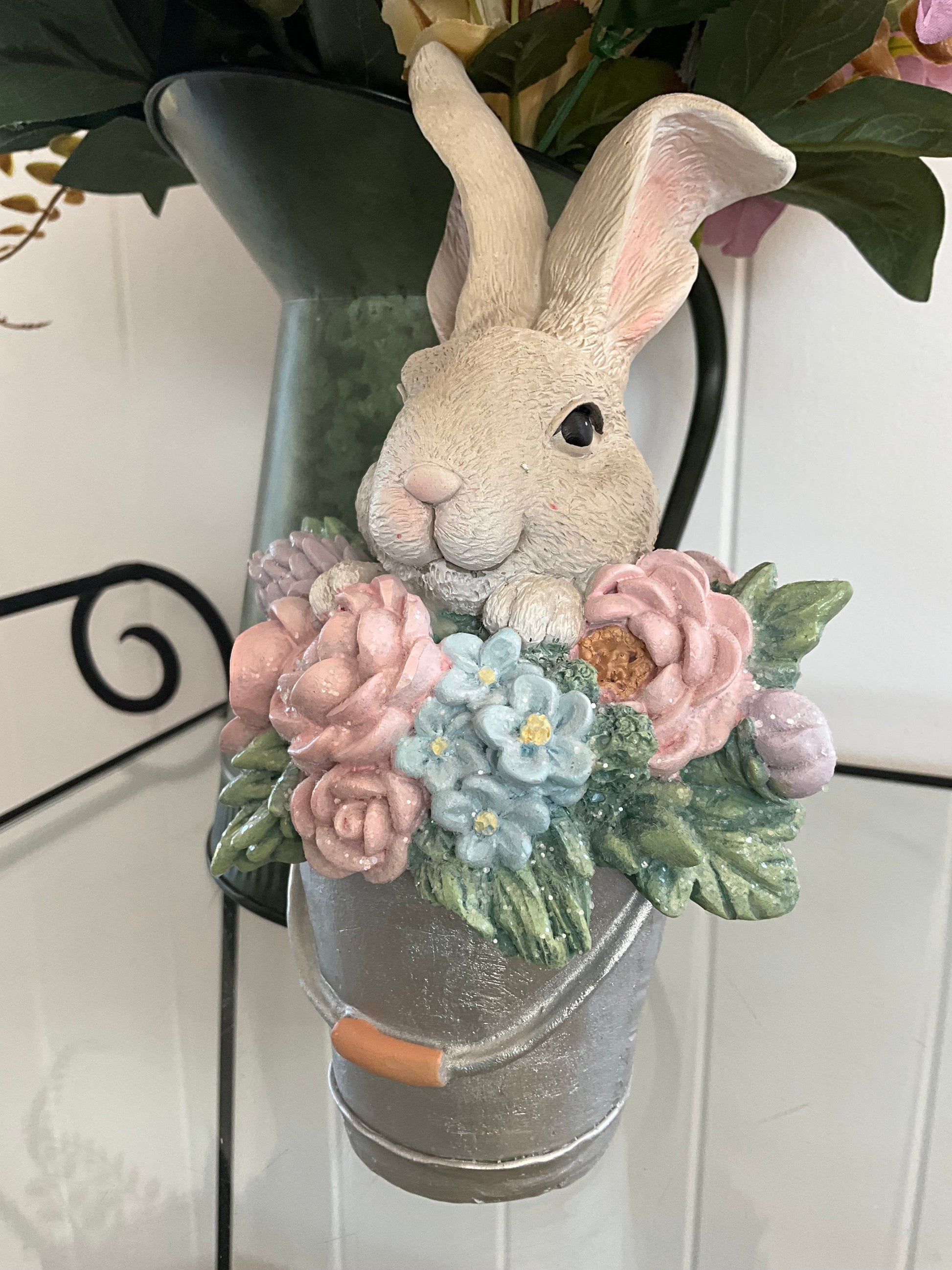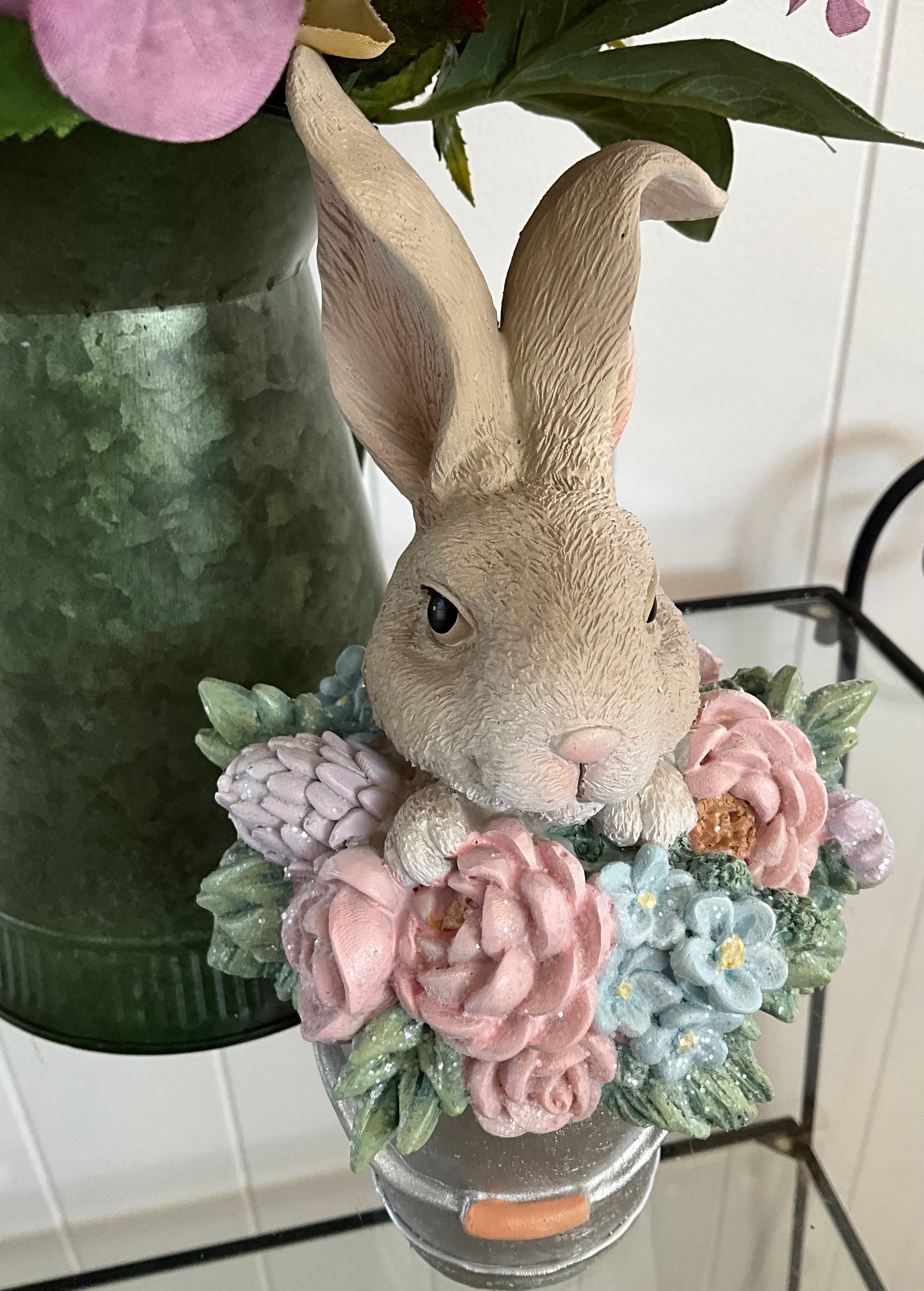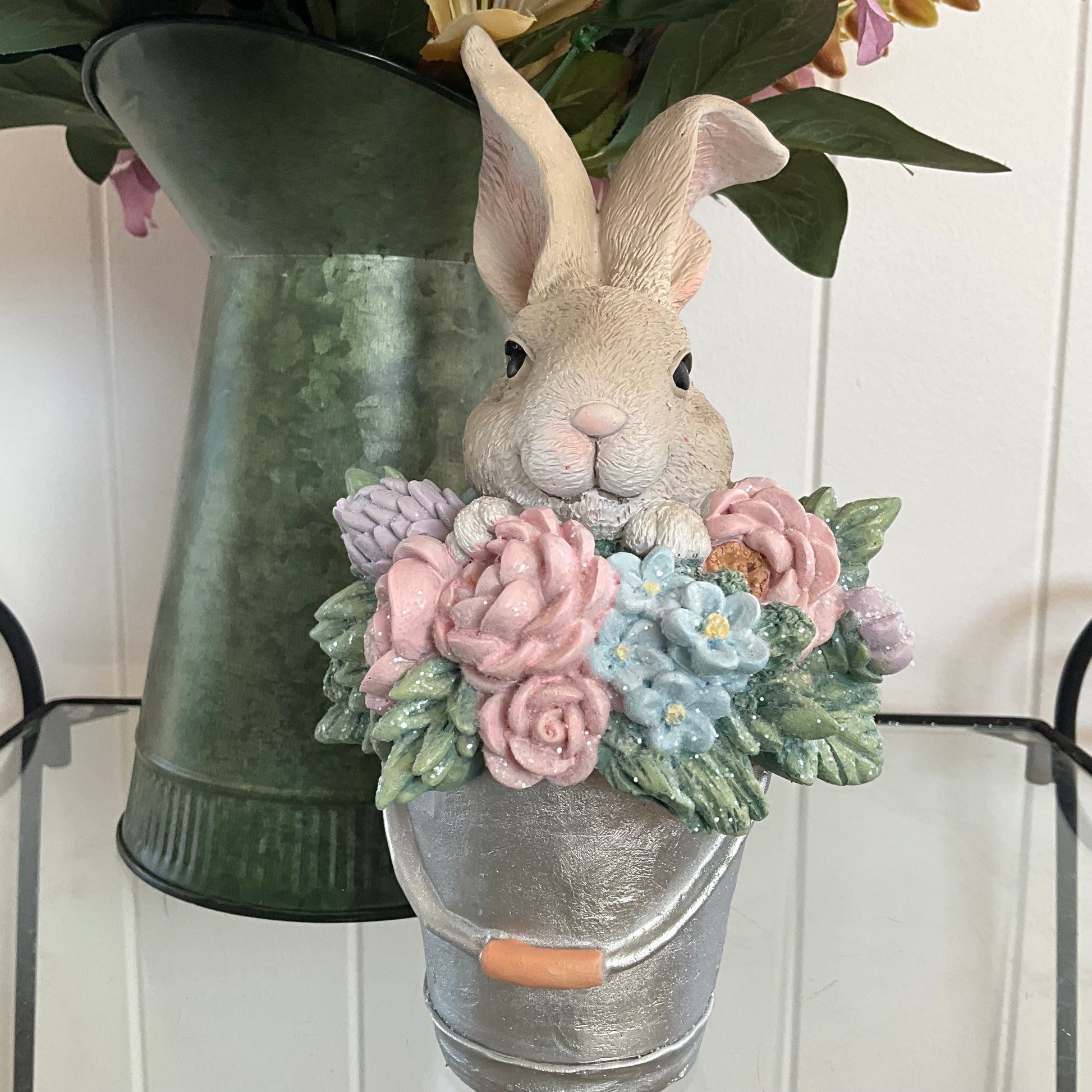 Sweet soft brown Easter bunny sitting in a silver coloured pail surrounded with soft pastel coloured flowers. Resin.