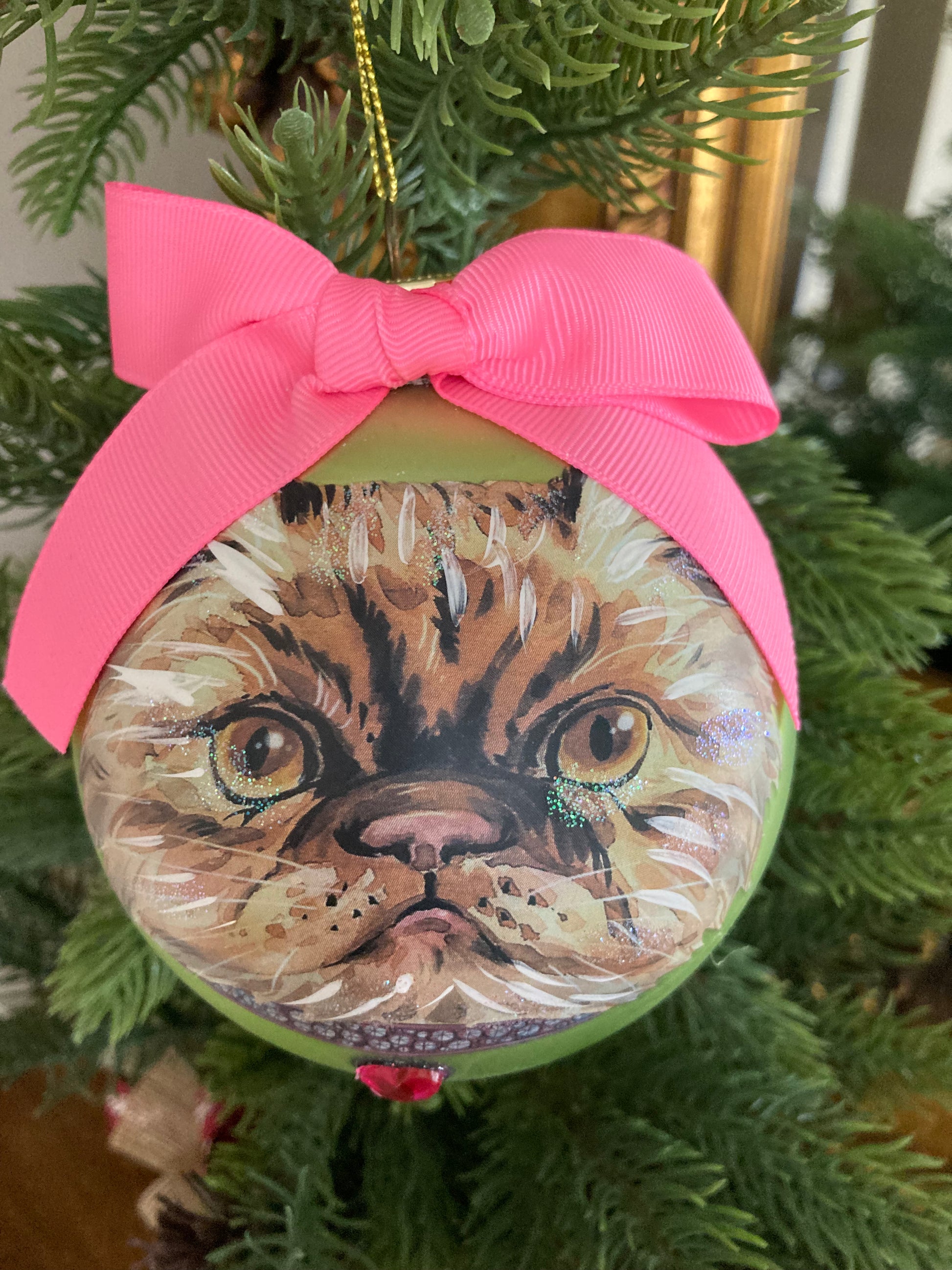Green glass ball with a pussy cat with a pink bow. Don’t think she likes the bow! Dimension: 11cm