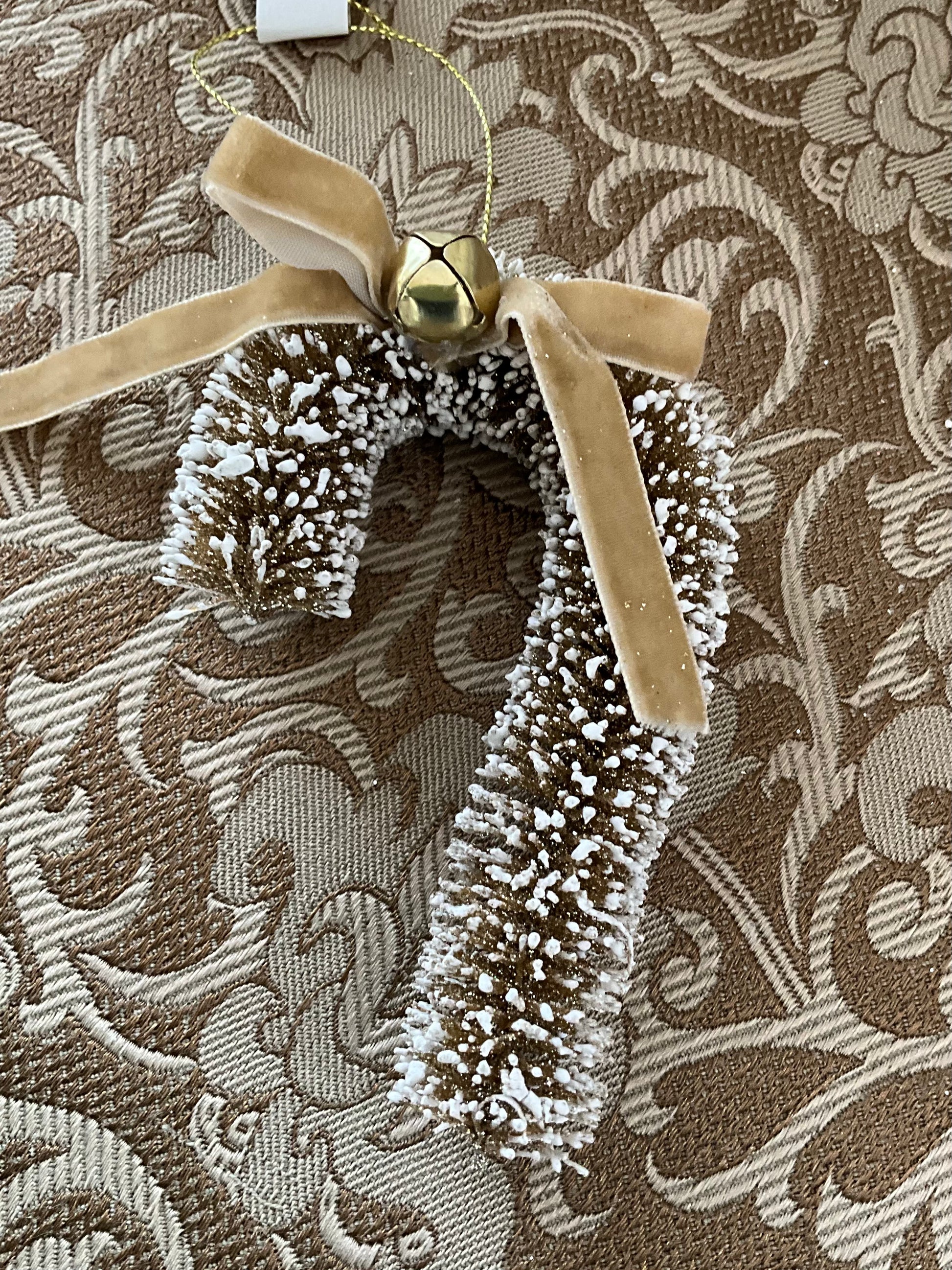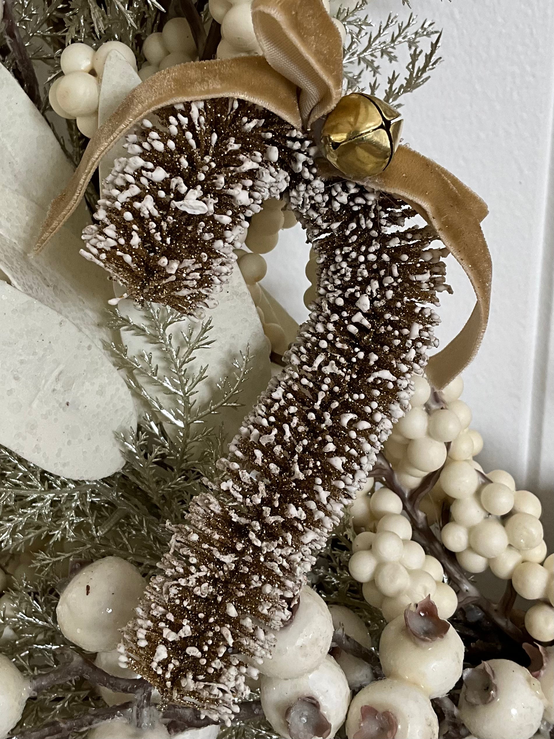 Champagne gold sisal cane in gold with gold velvet bow. Available in wreath shape.