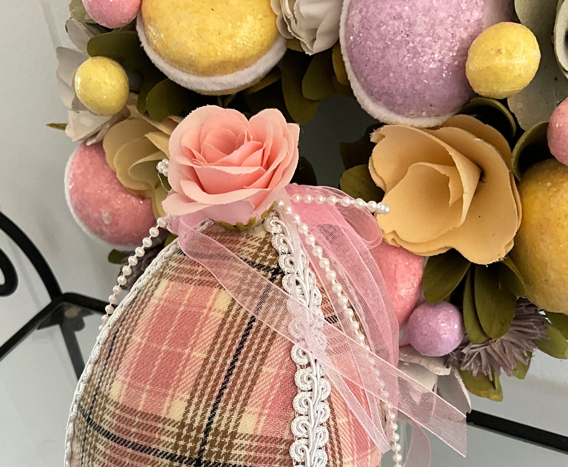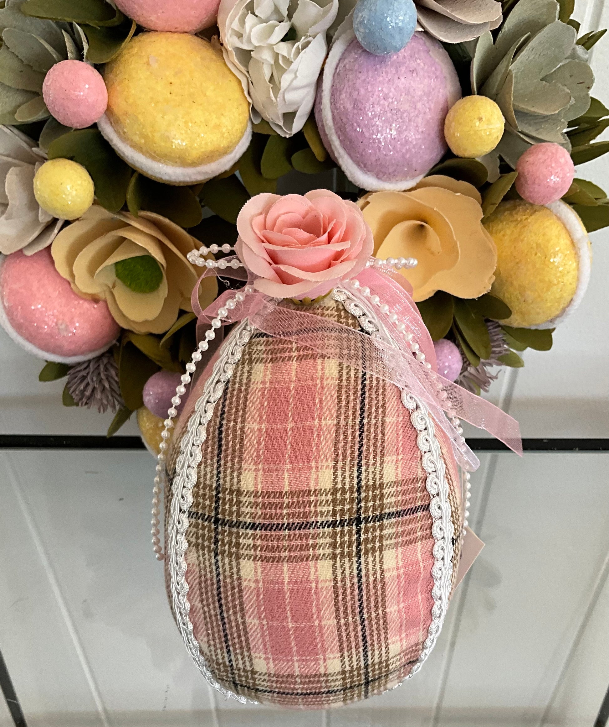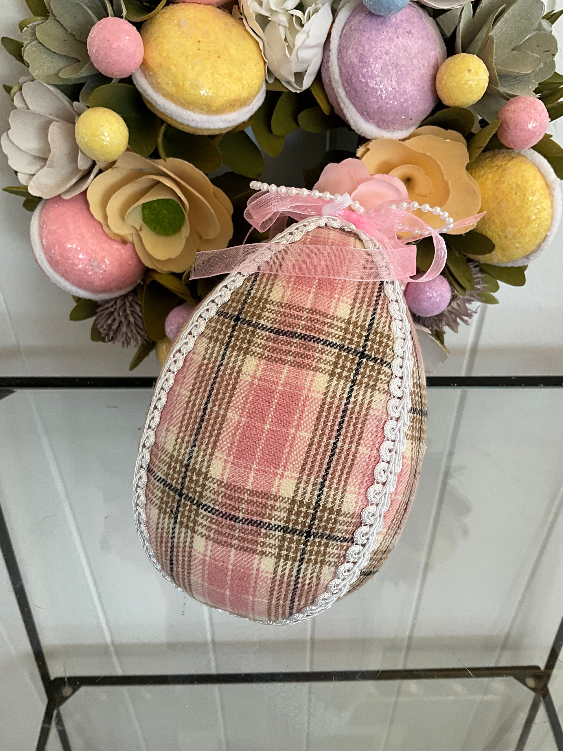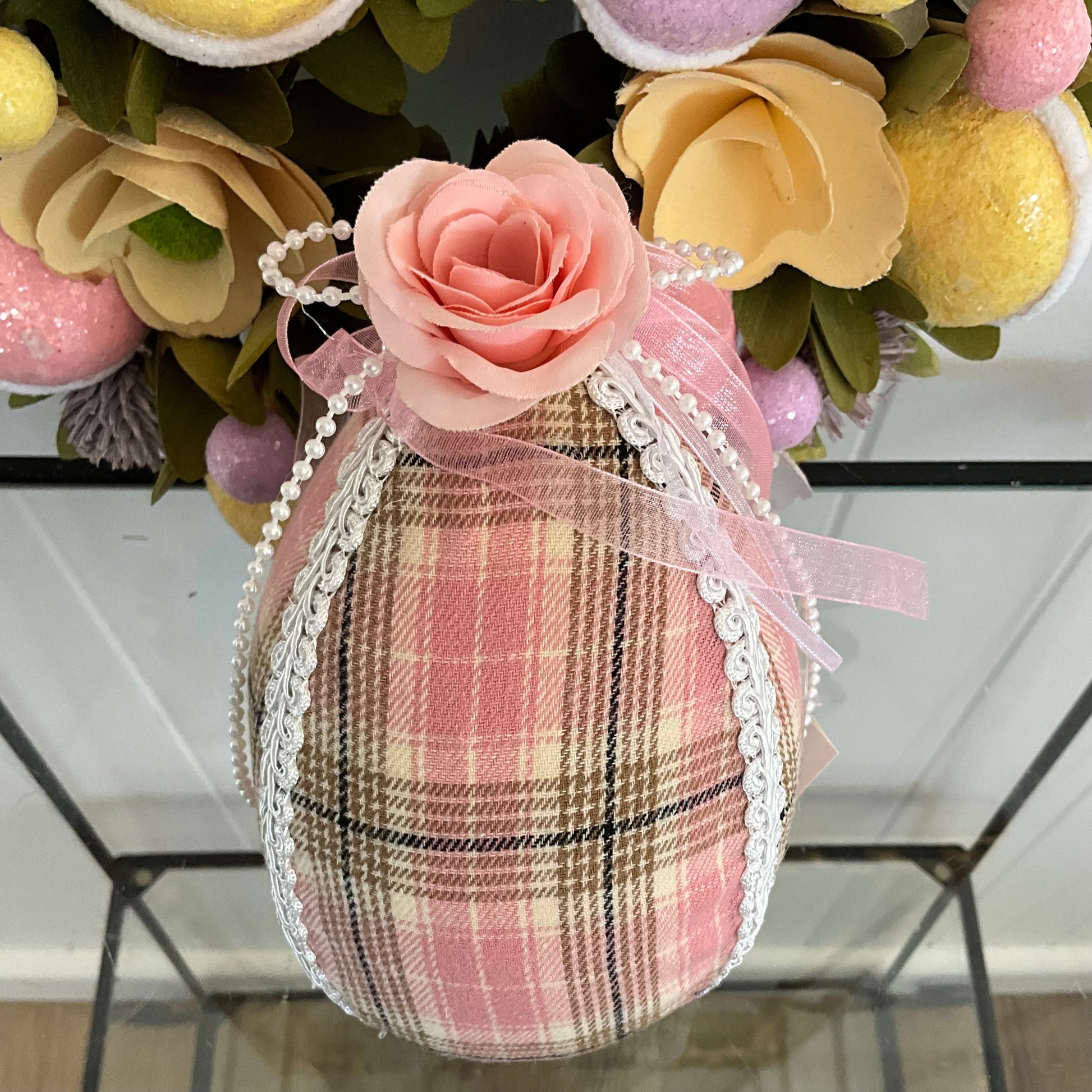 Decorative striped fabric and trim Easter egg hanging decoration with a flower and ribbons. Larger size. Pink, brown and apricot colours.