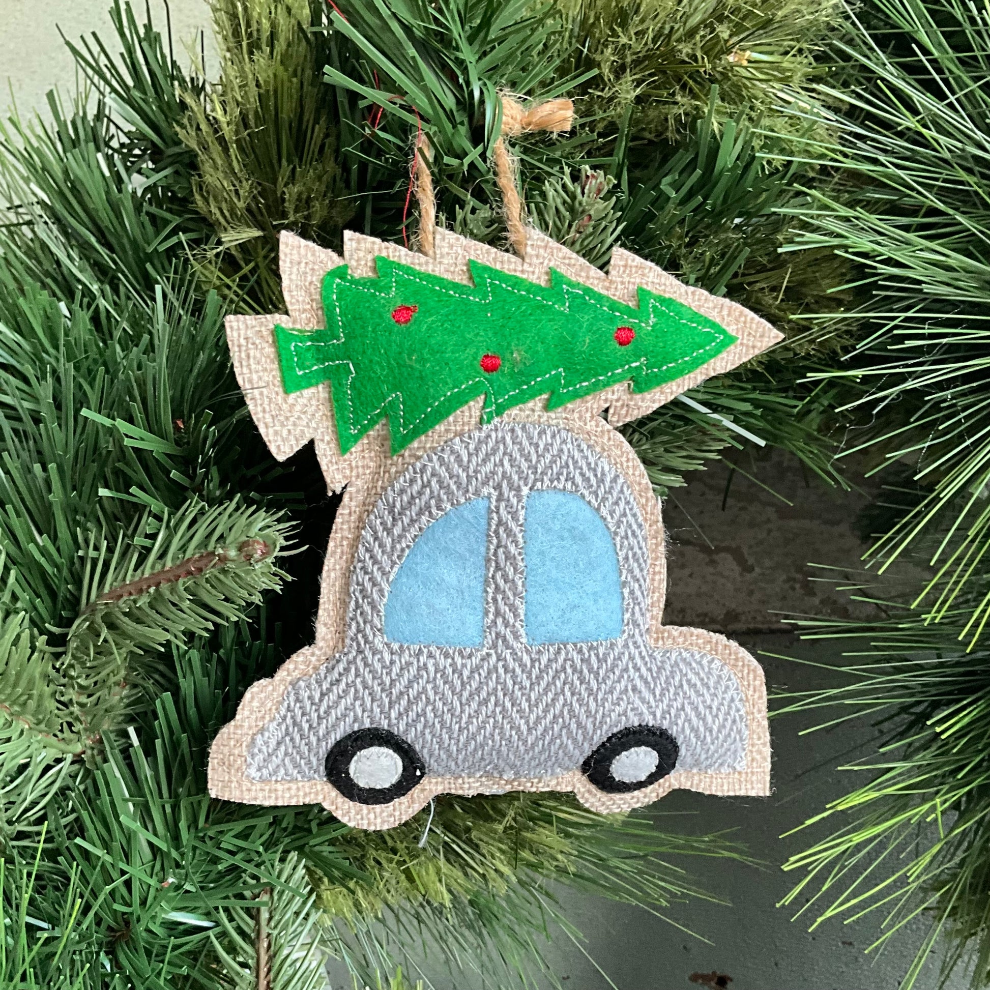 Fabric and felt Christmas deco of a car carrying a Christmas tree.