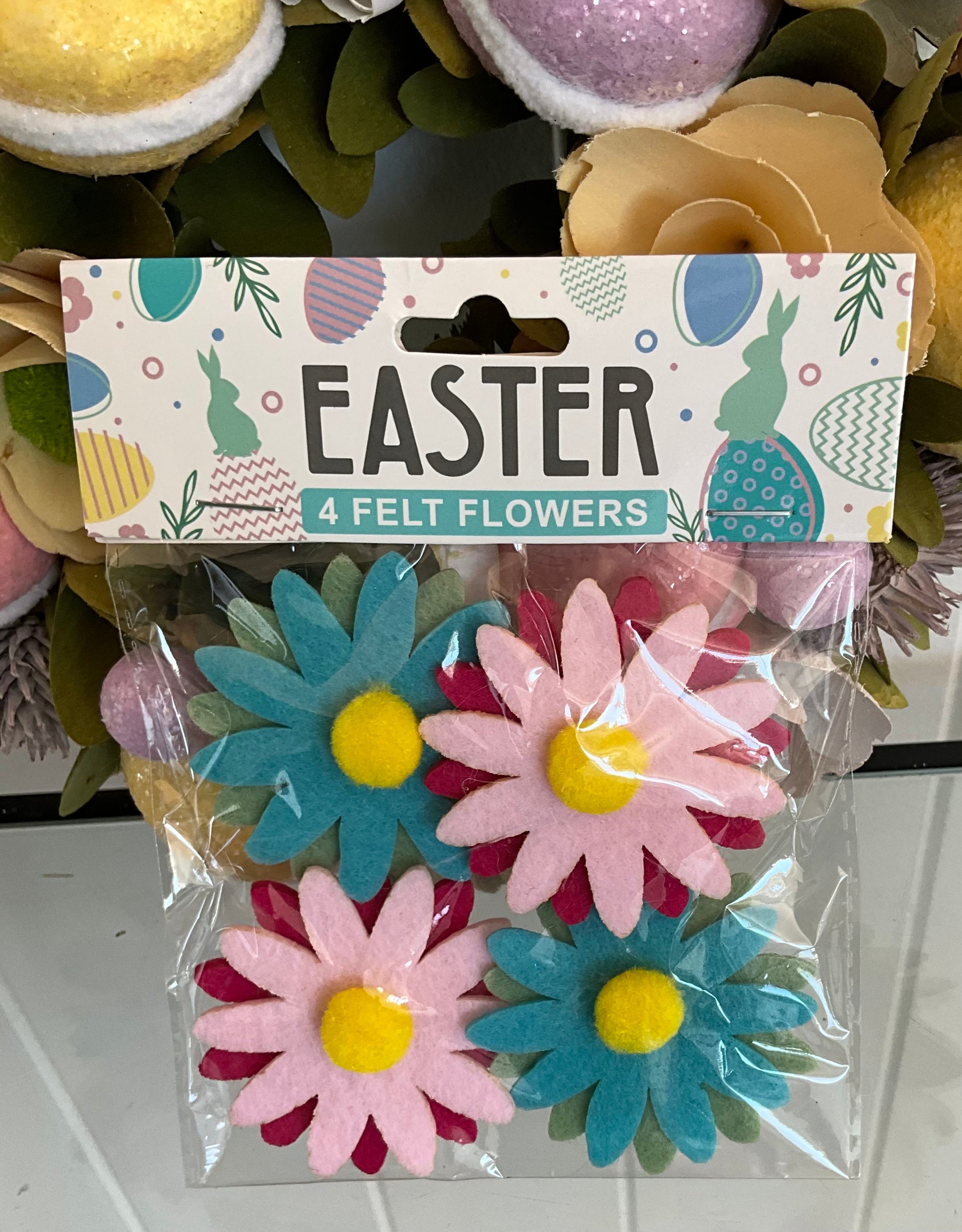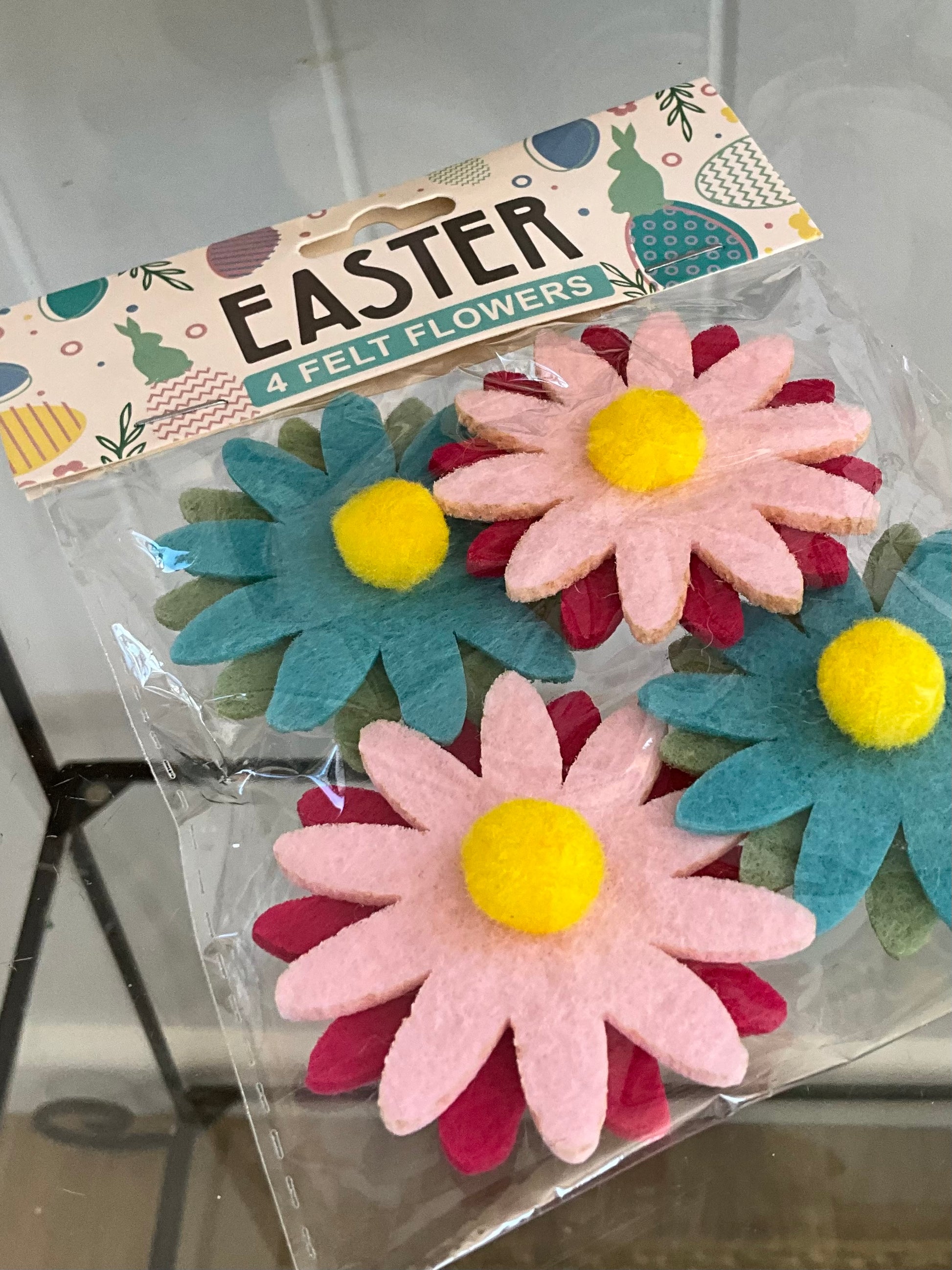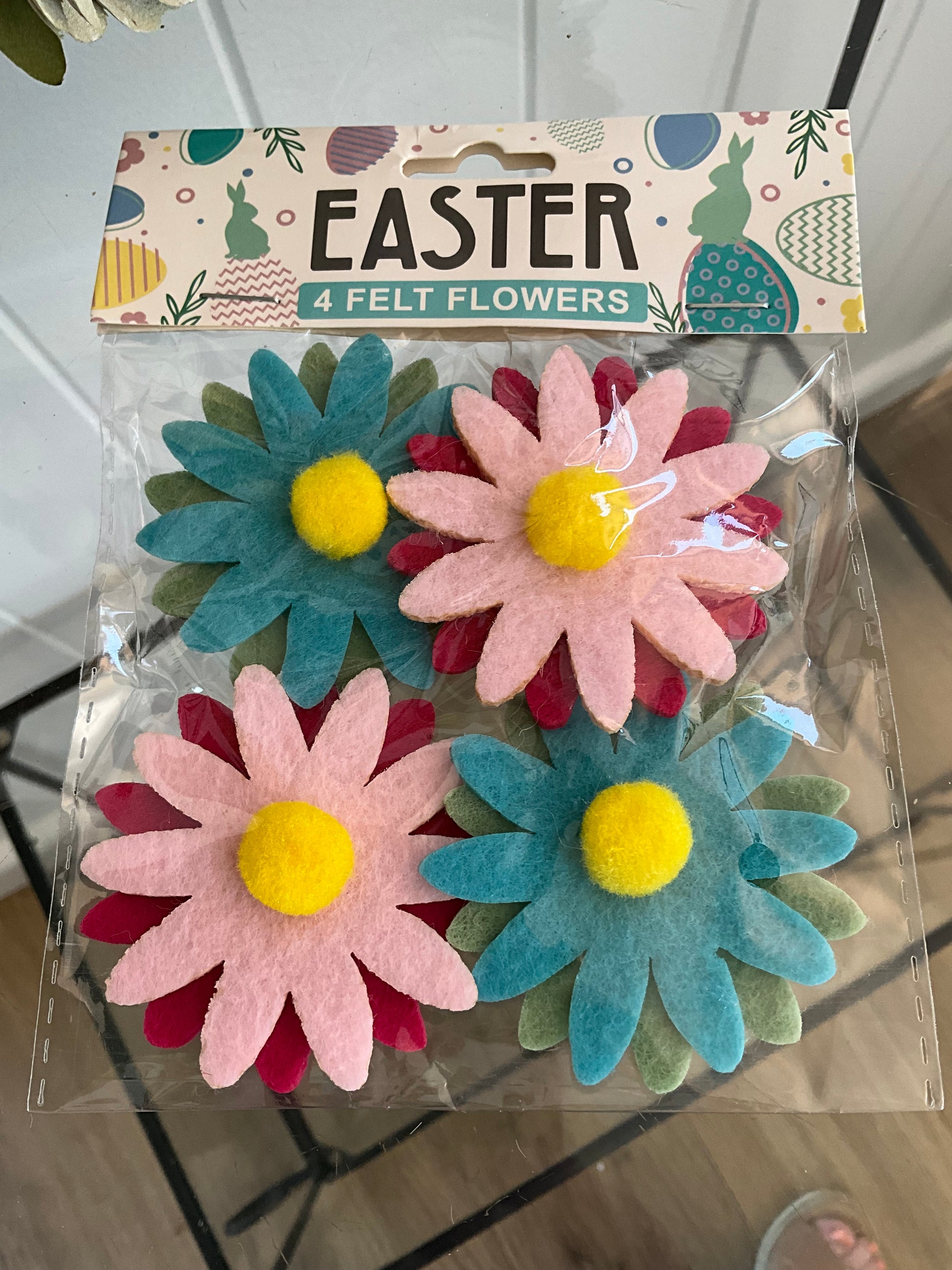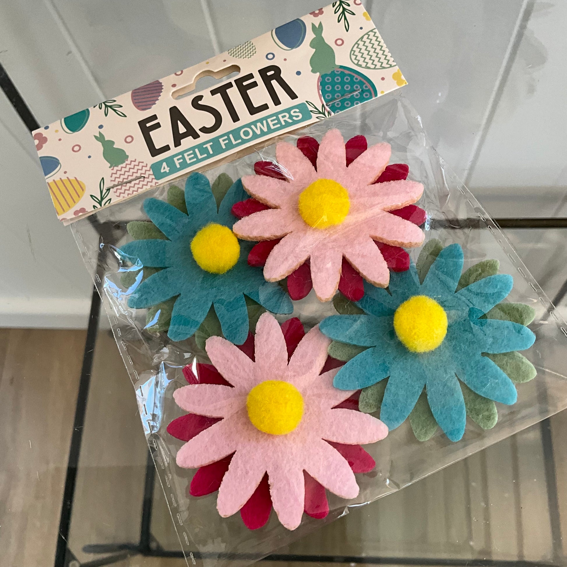 Set of four decorative felt flowers for your crafting and Easter hat making. Blue and pink.