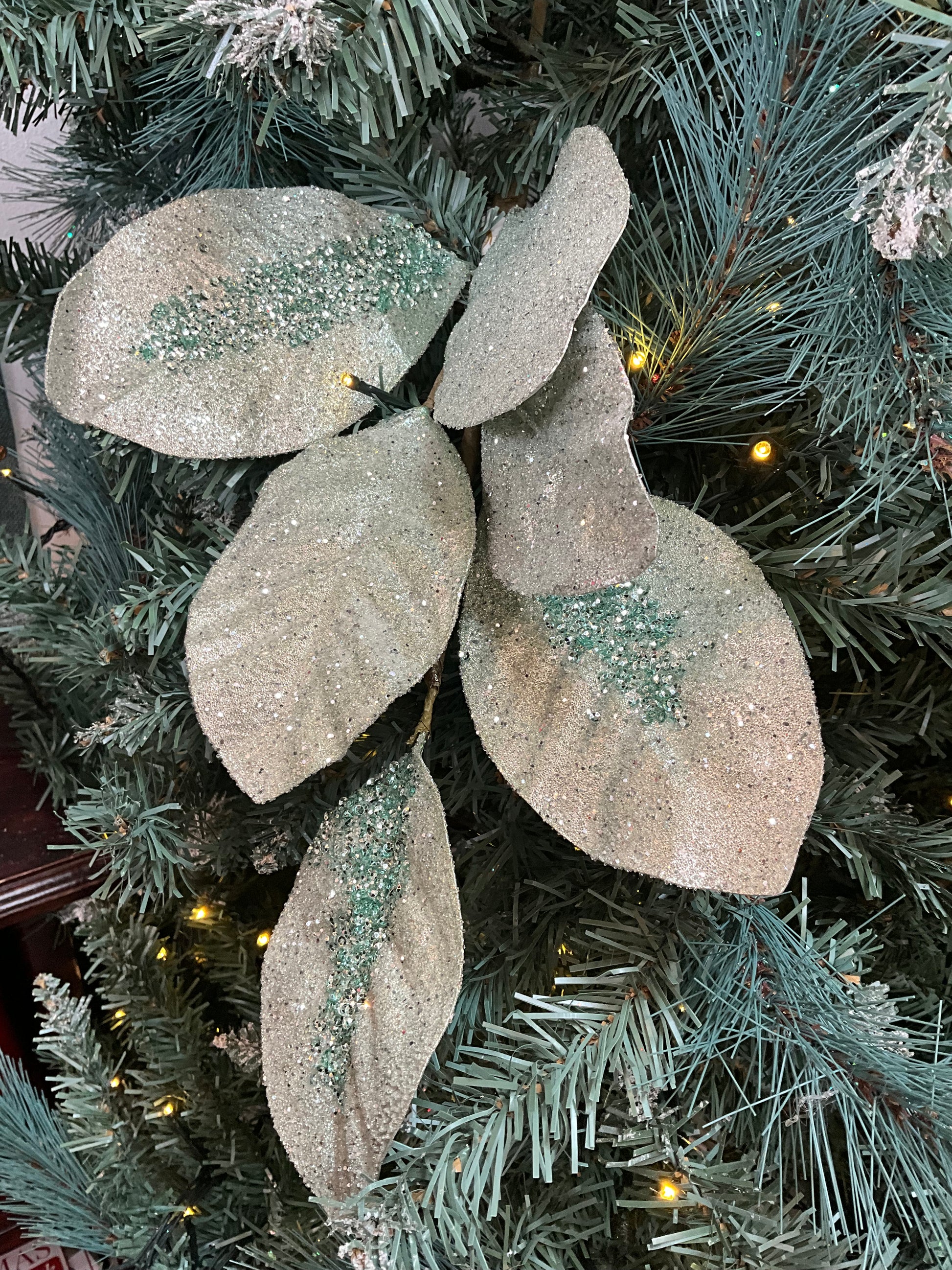 Large-leaf soft green frosted glitter spray.