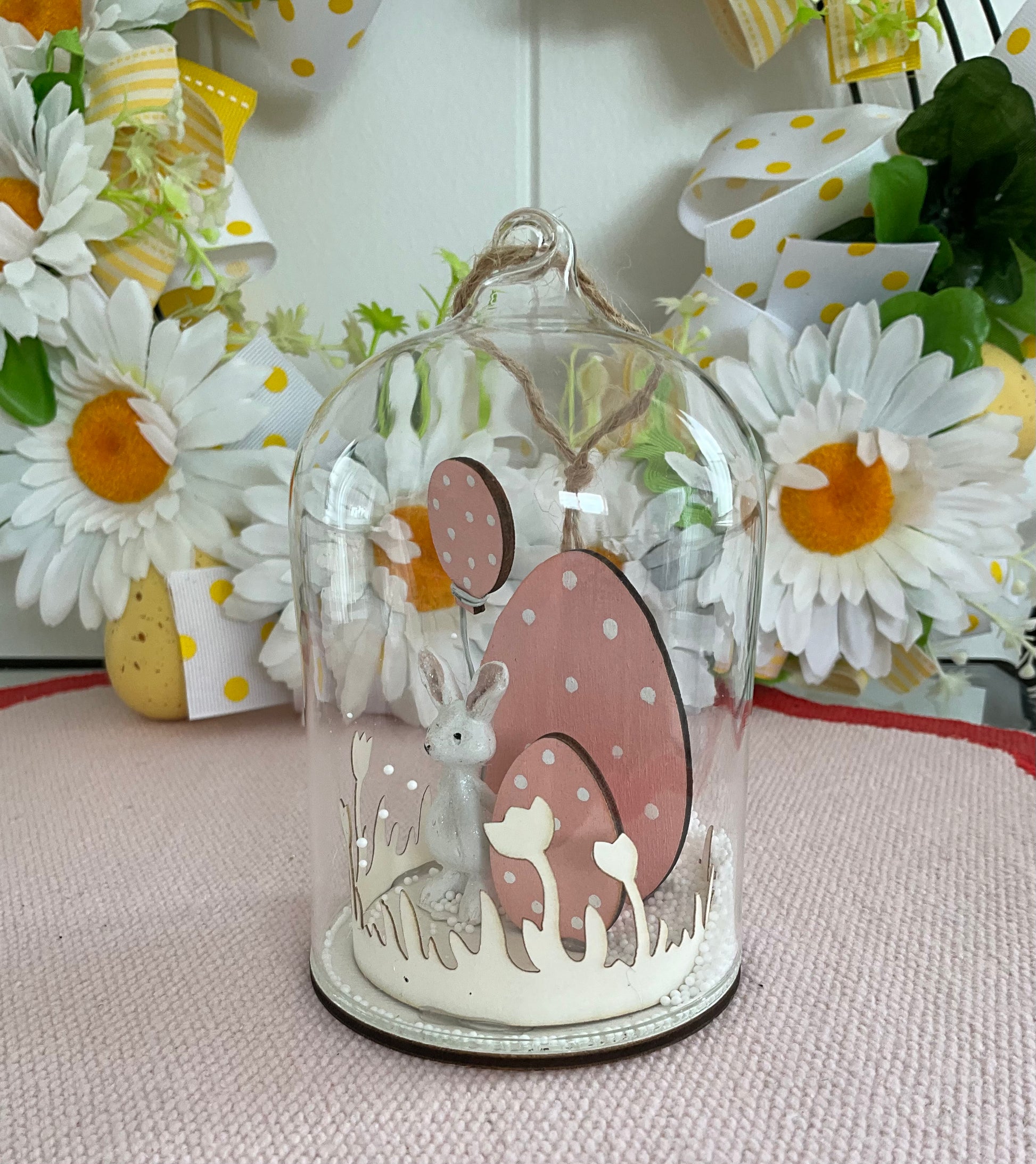 Pretty glass dome hanging deco with pink bunny and eggs.
