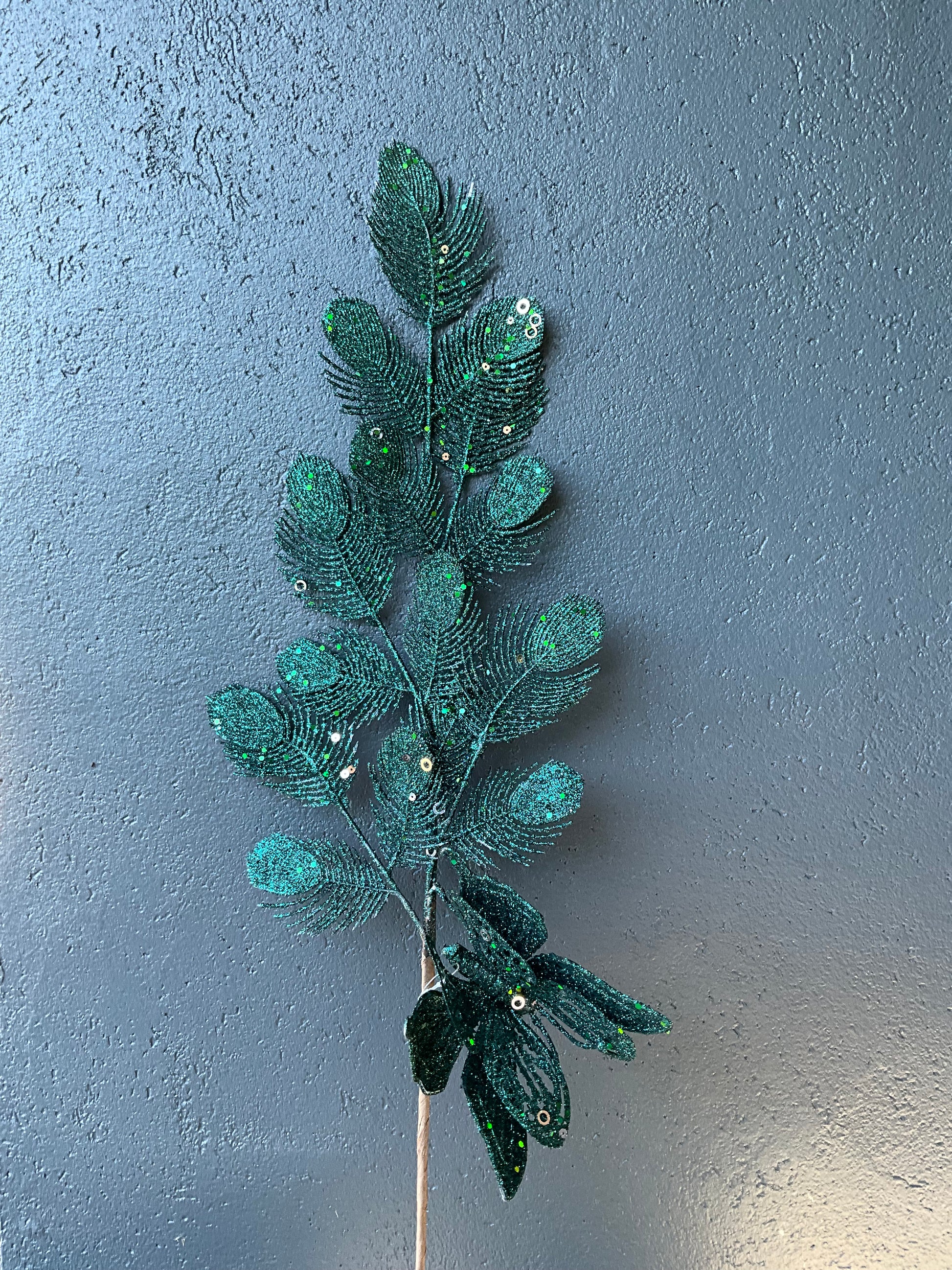 Very glittery dark green/peacock green leaf spray with a peacock feathers and glitter butterfly.