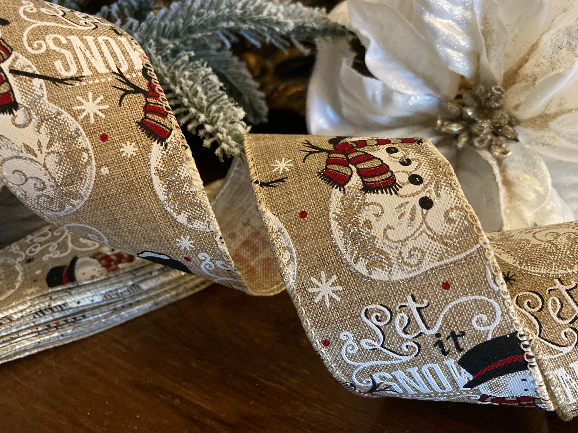 Let It Snow wired jute ribbon with a sweet snowman. Dimension: 5cm wide x 6m long