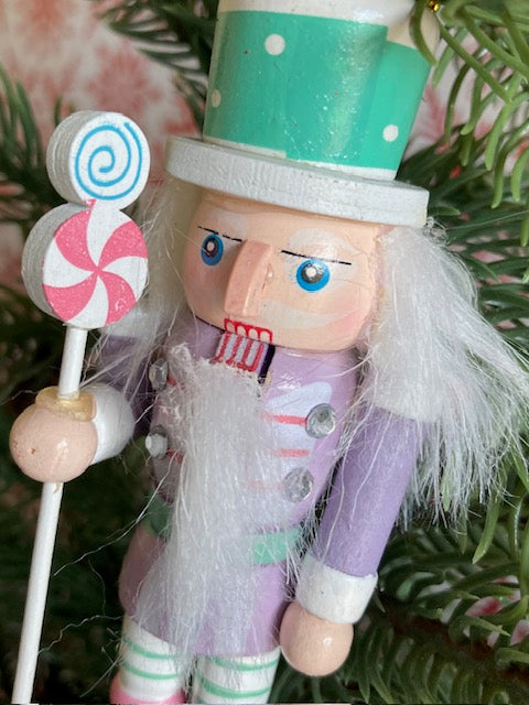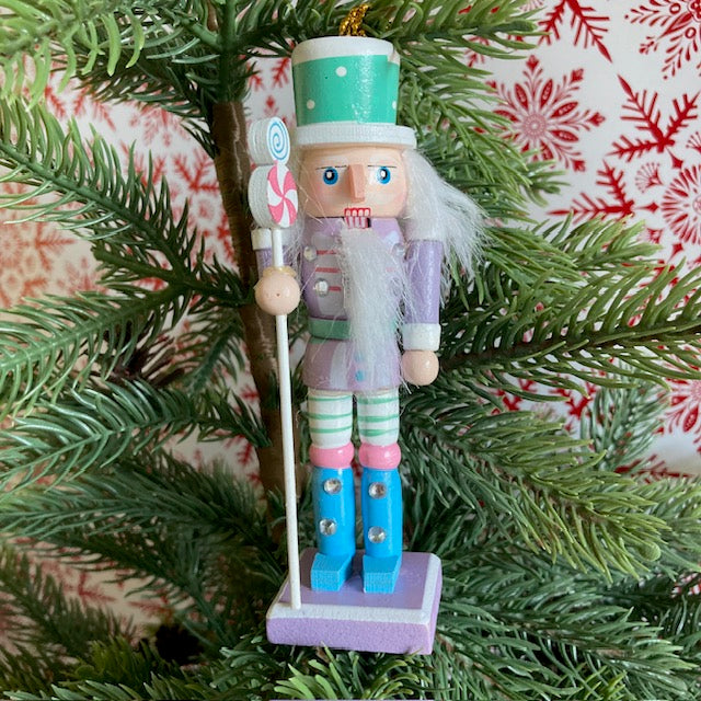 Mauve wooden nutcracker tree hanging decoration. Touches of blue and mint green. Three other colours are available. Dimension: 13cm