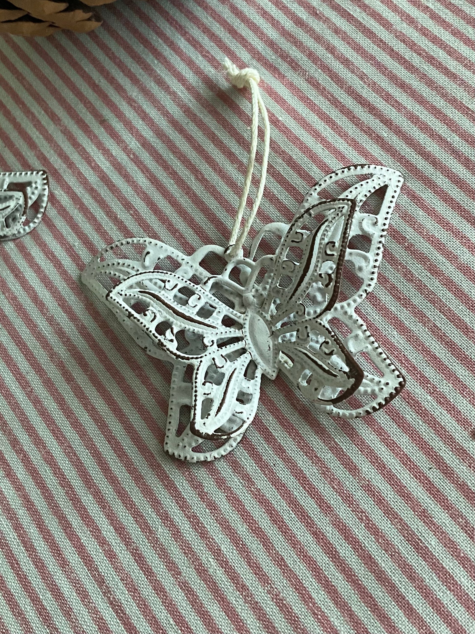 Pair of two rustic white metal butterflies. Hanging decoration.