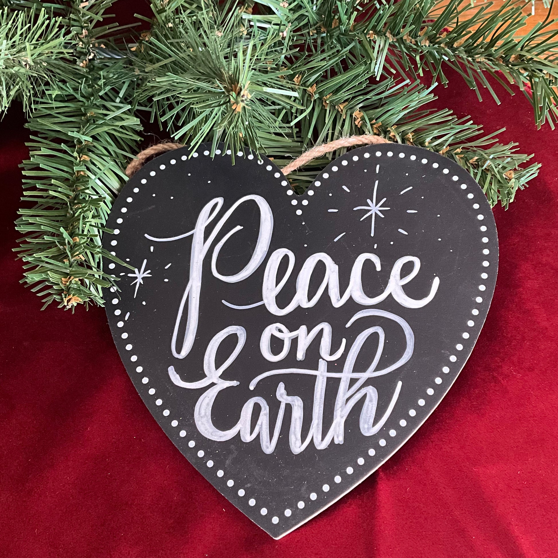 Heart blackboard tree decoration hand written with Peace on Earth. Calligraphy by Written By Hand. One only.