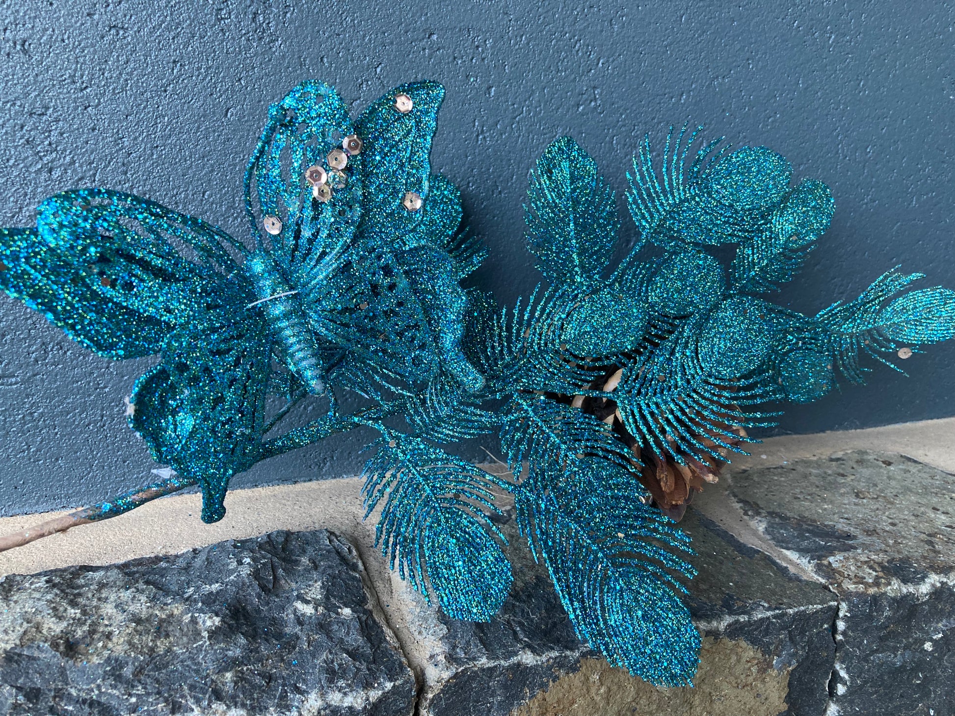 Striking peacock blue leaf spray with a butterfly. Glitter.