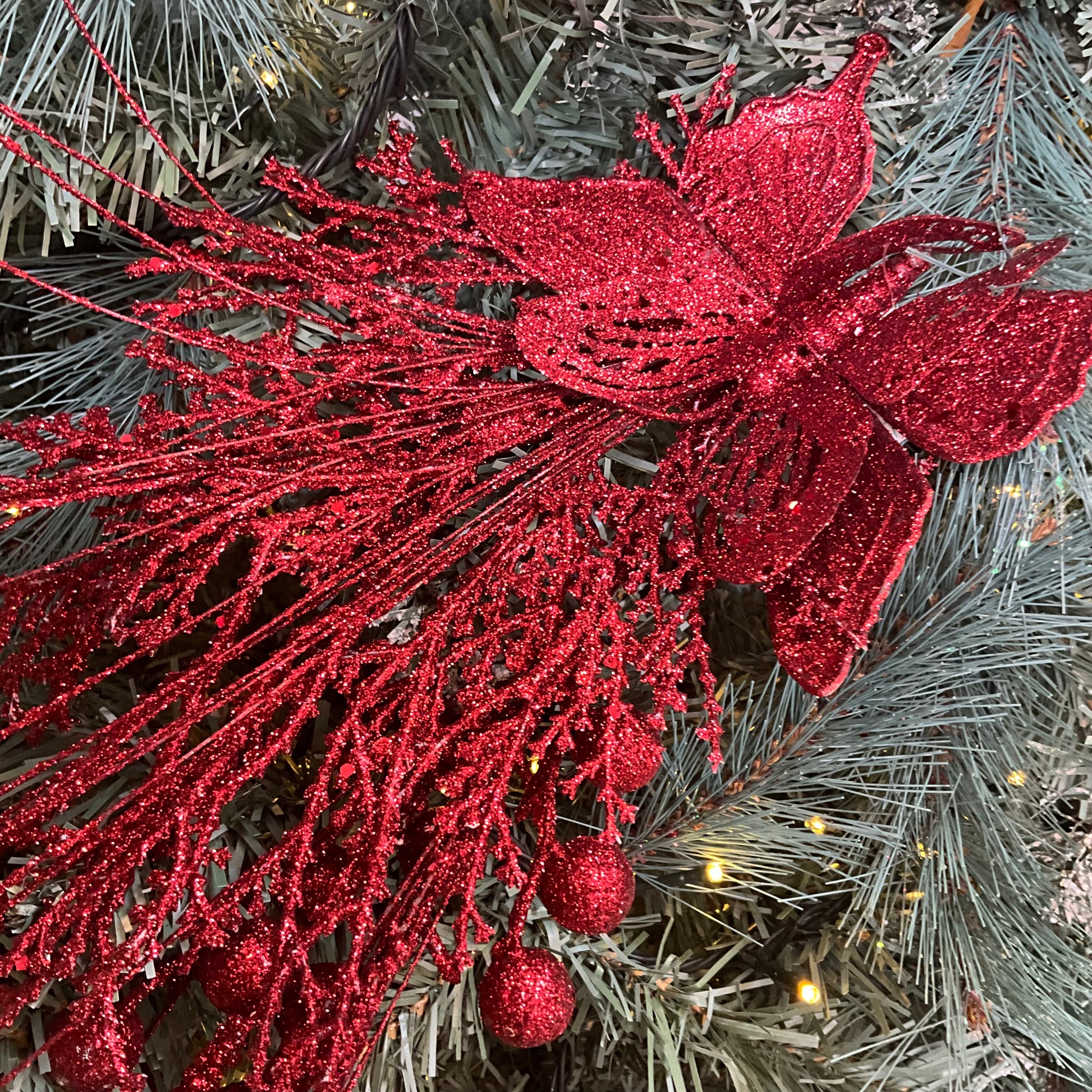 Darker red glitter leaf branch spray with butterfly.