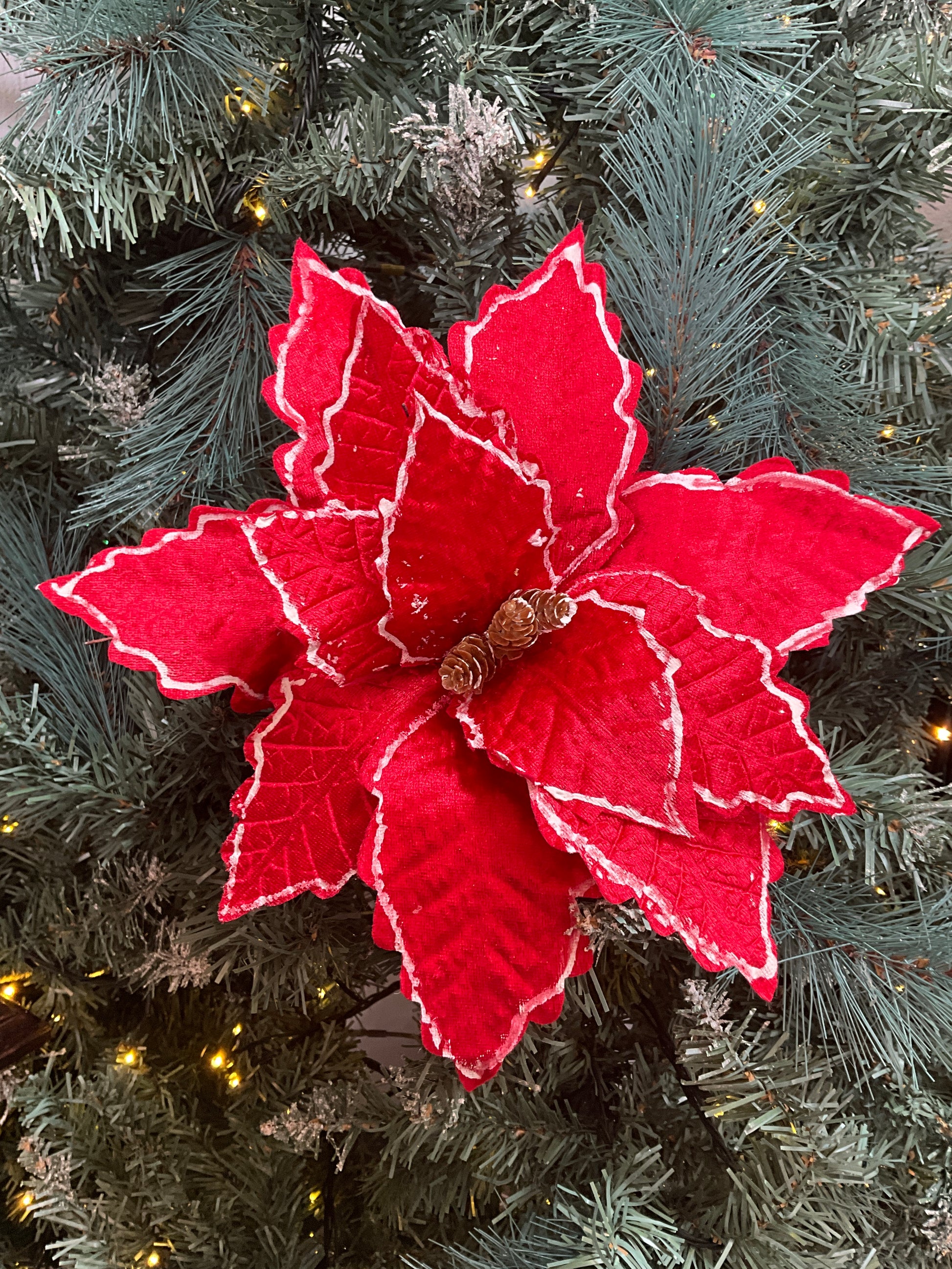 Red velvet Christmas Poinsettia with mini Pinecones. White trim around the petals.