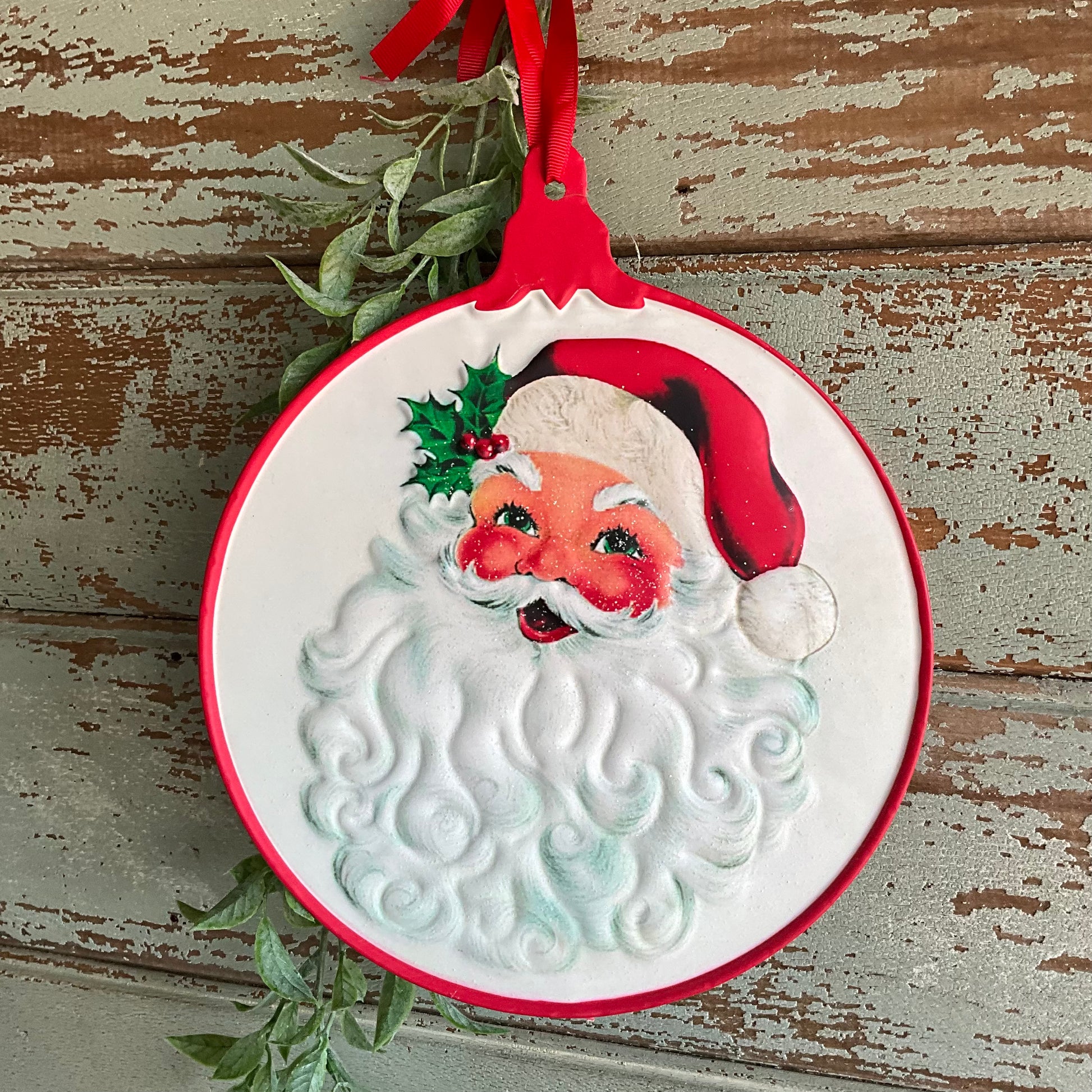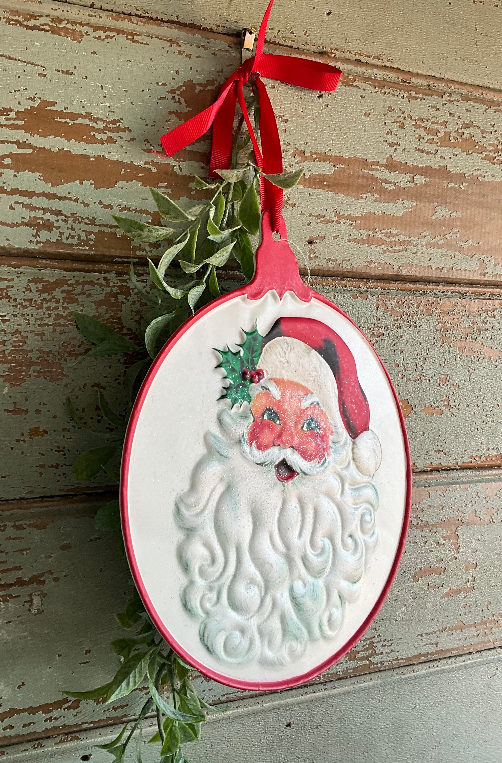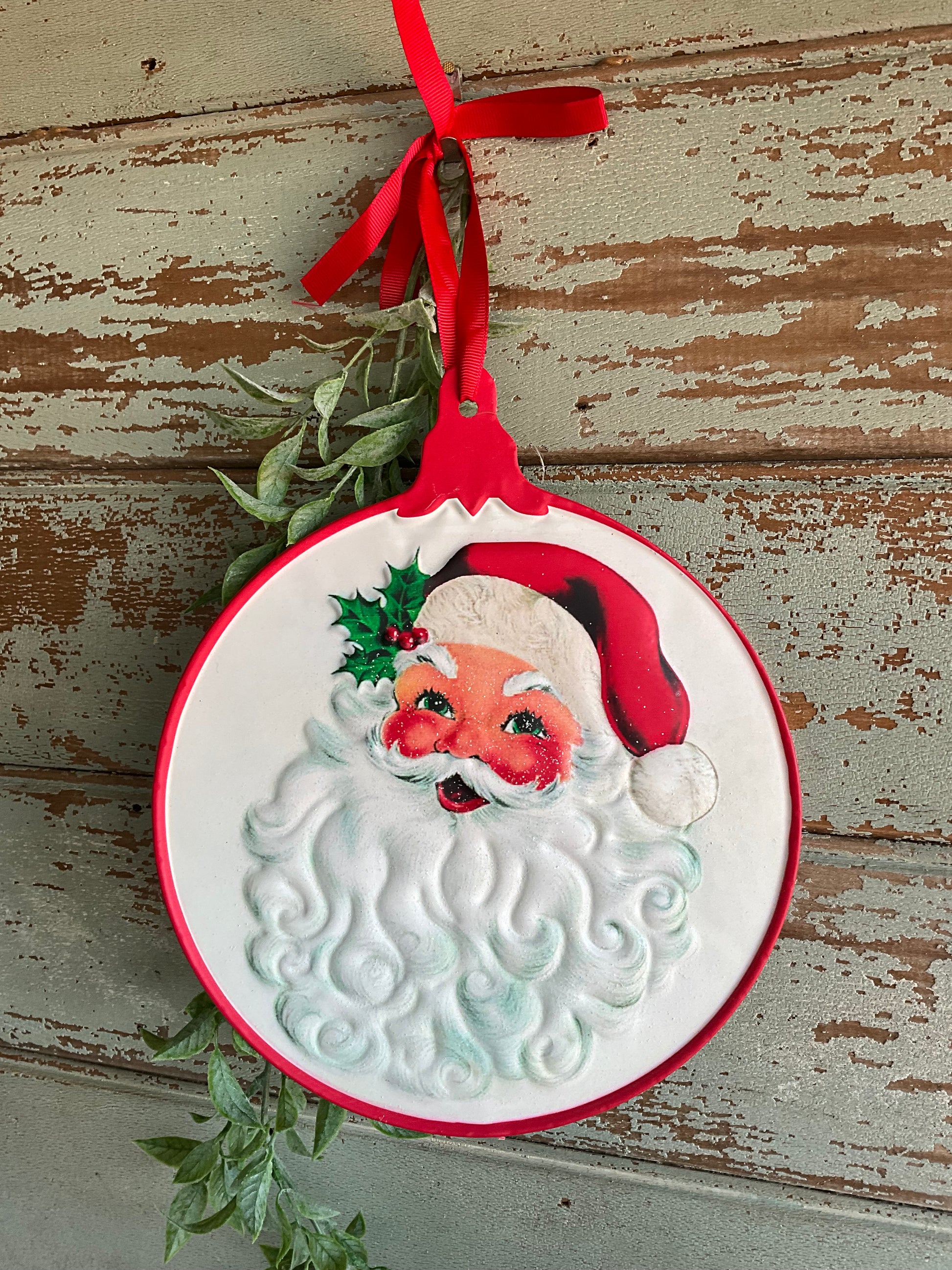 Gorgeous circular tin sign with an embossed Santa head image. Red ribbon. RAZ