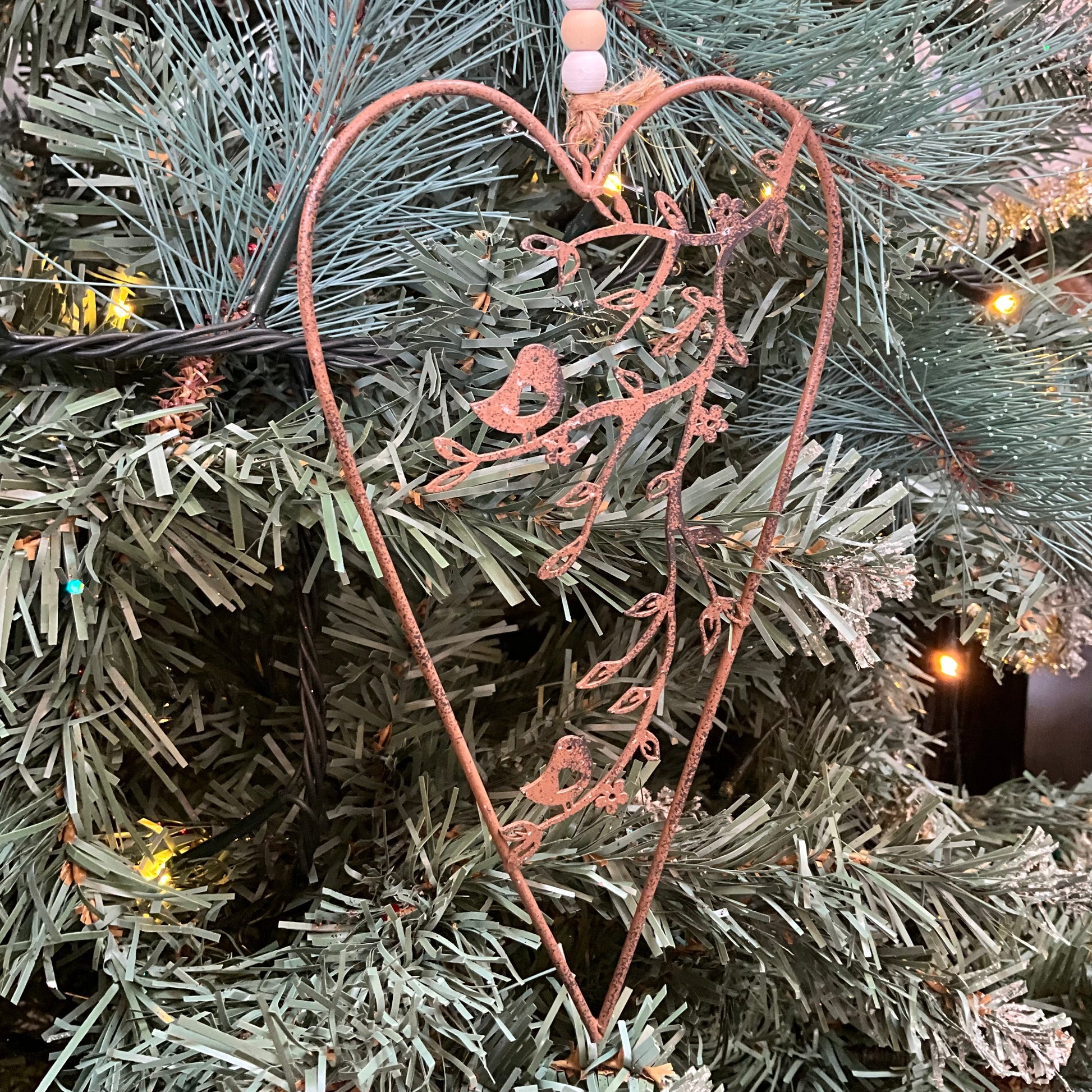 Rustic heart-shaped hanging decoration featuring birds on branches. Lovely for inside or outside your home. Features vintage beads.