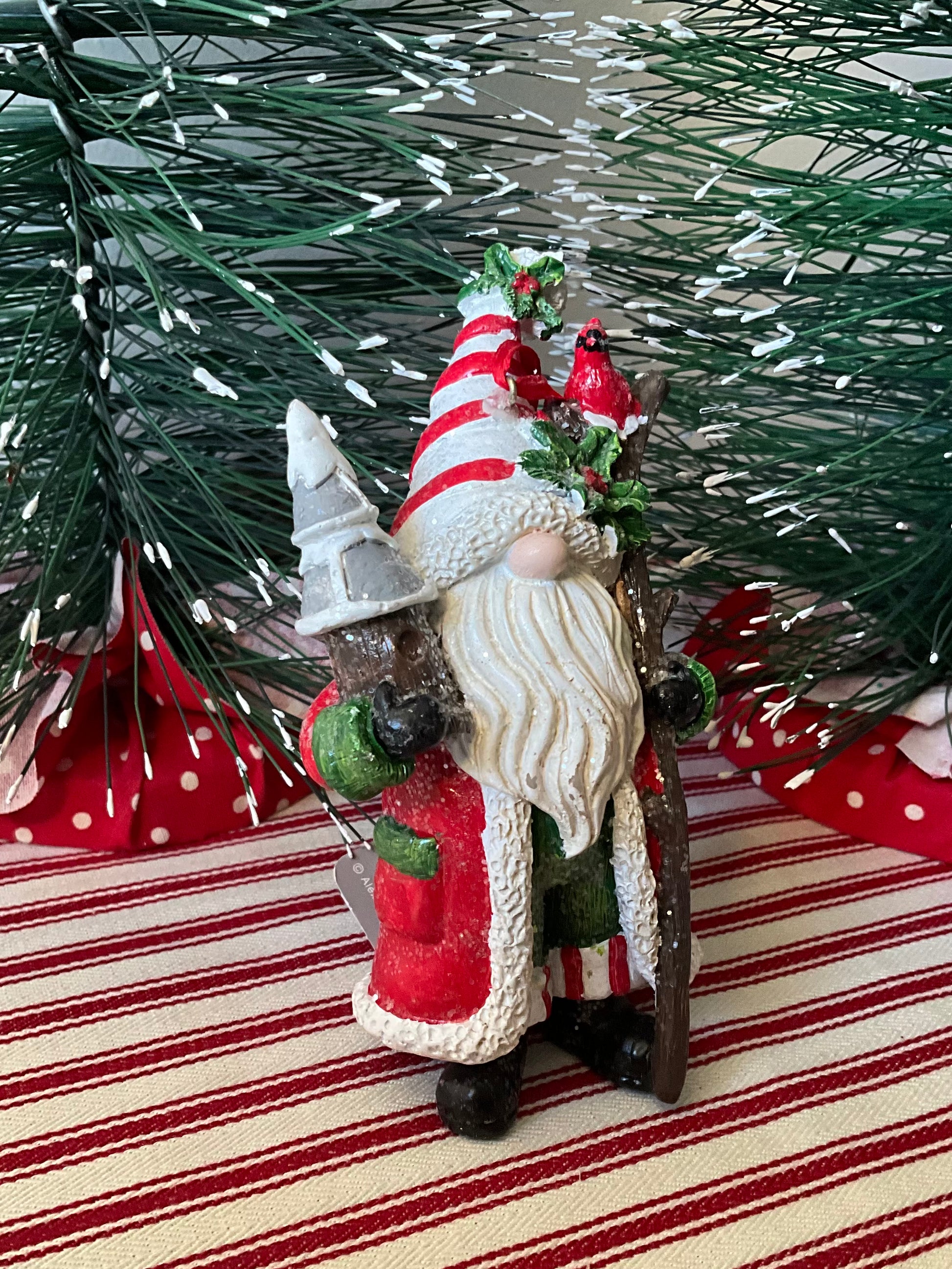 Cute Gnome Santa with striped pants holding a cardinal bird and Christmas birdcage. Tree decoration by RAZ. Resin.