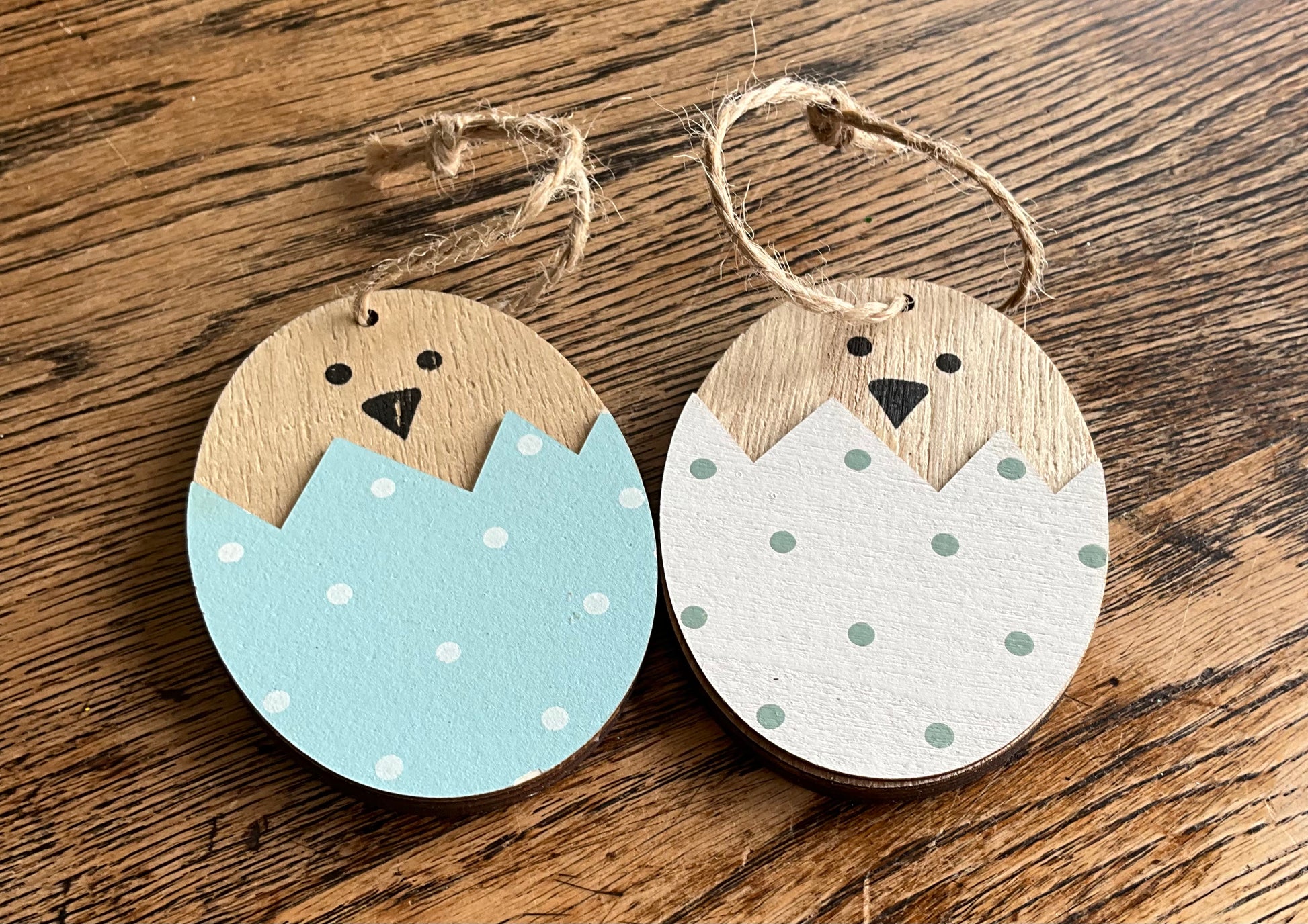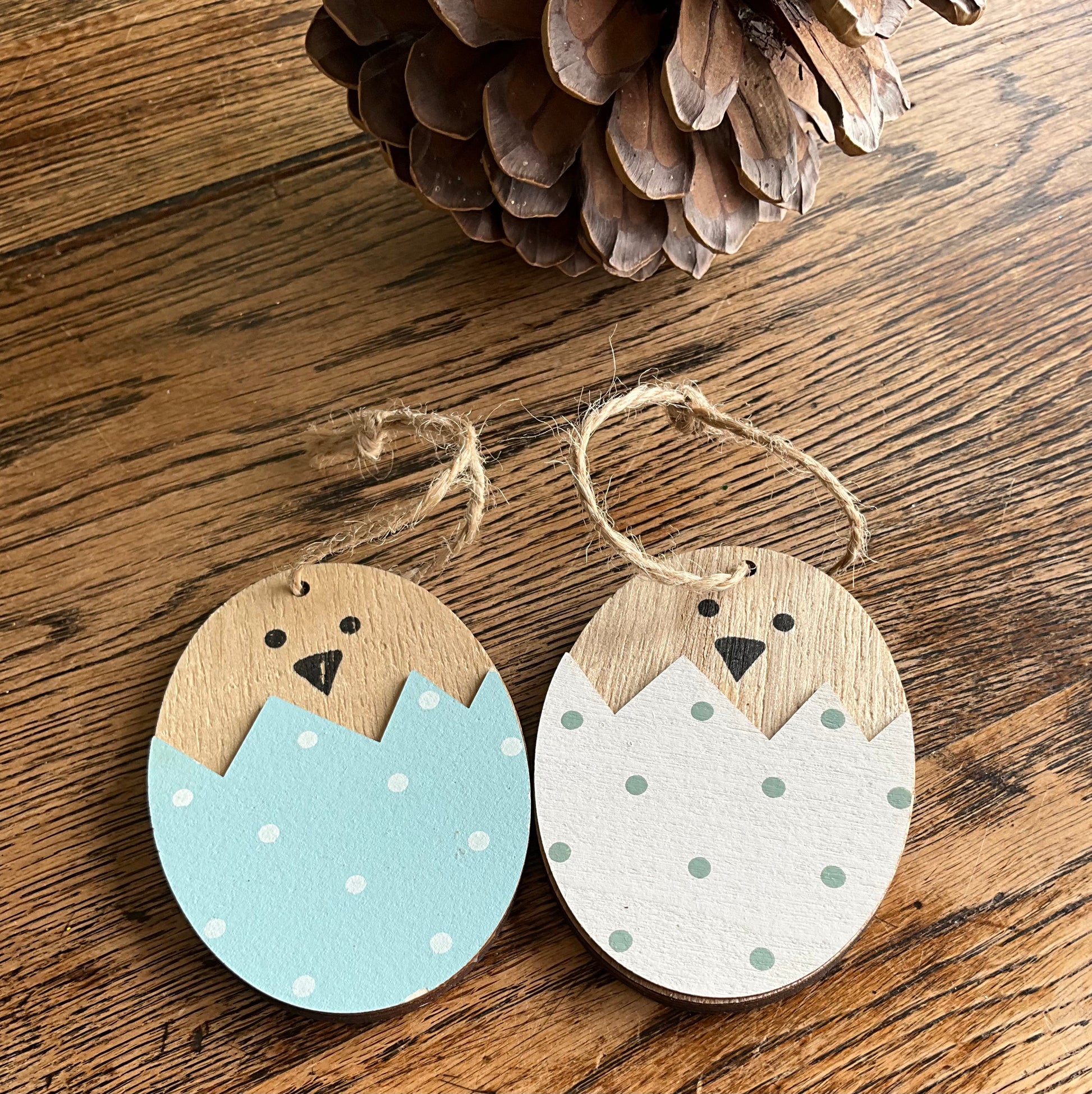 Set of two painted wooden eggs. One white and one blue. Hanging decoration.