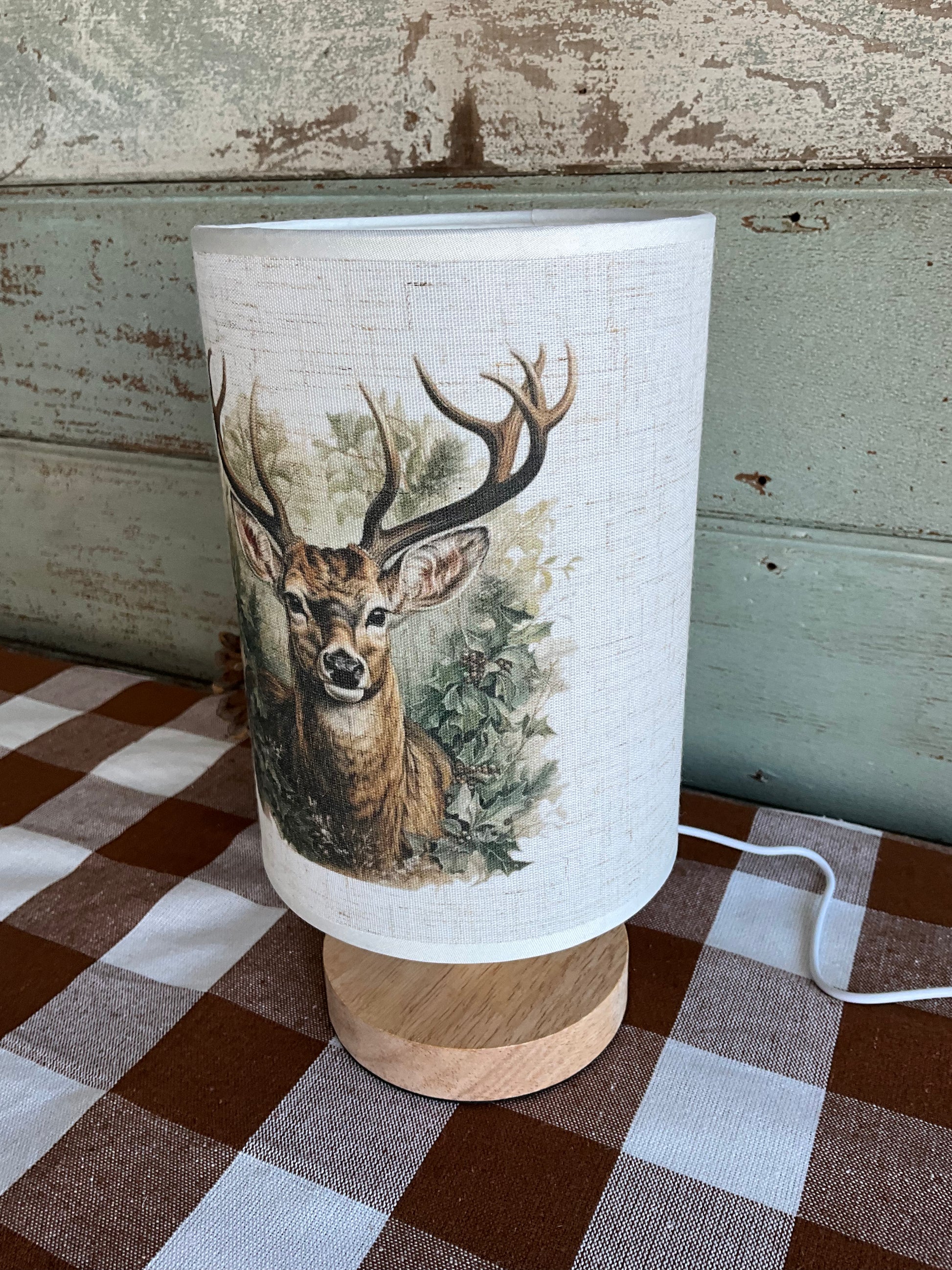 Cute small lamp with a fabric shade featuring a wintery forest deer design. Wooden base. Add some Christmas berries or foliage to add some Christmas sparkle. Powered by USB. No batteries required.