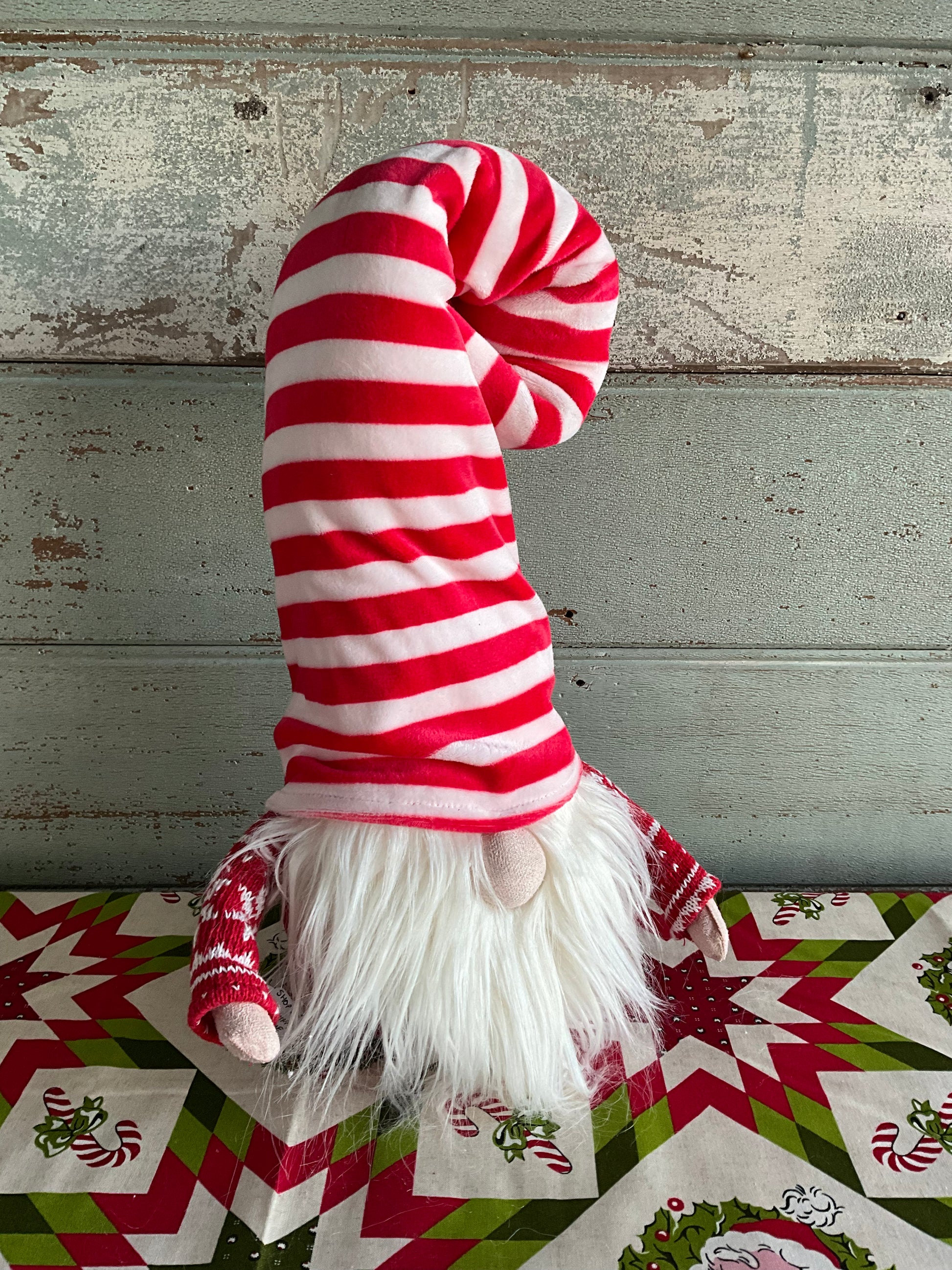 Tall fabric red and white striped hat gnome. Big white beard. Standing. RAZ