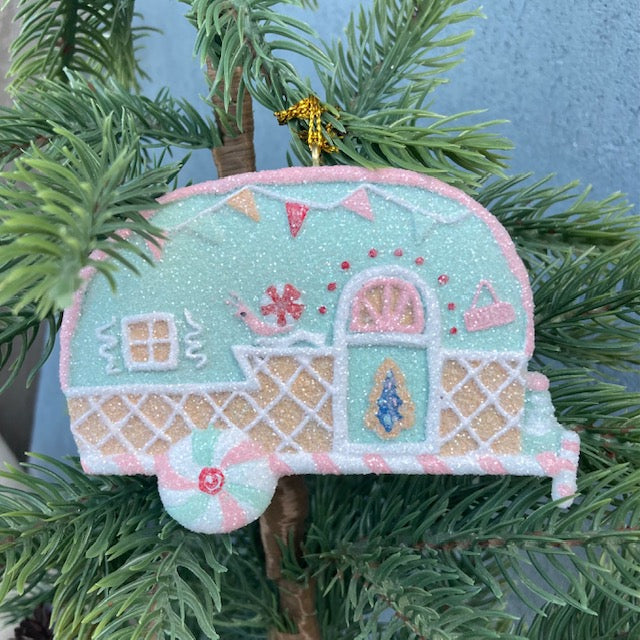 Frosted mint and pink caravan Christmas hanging decoration. Resin.