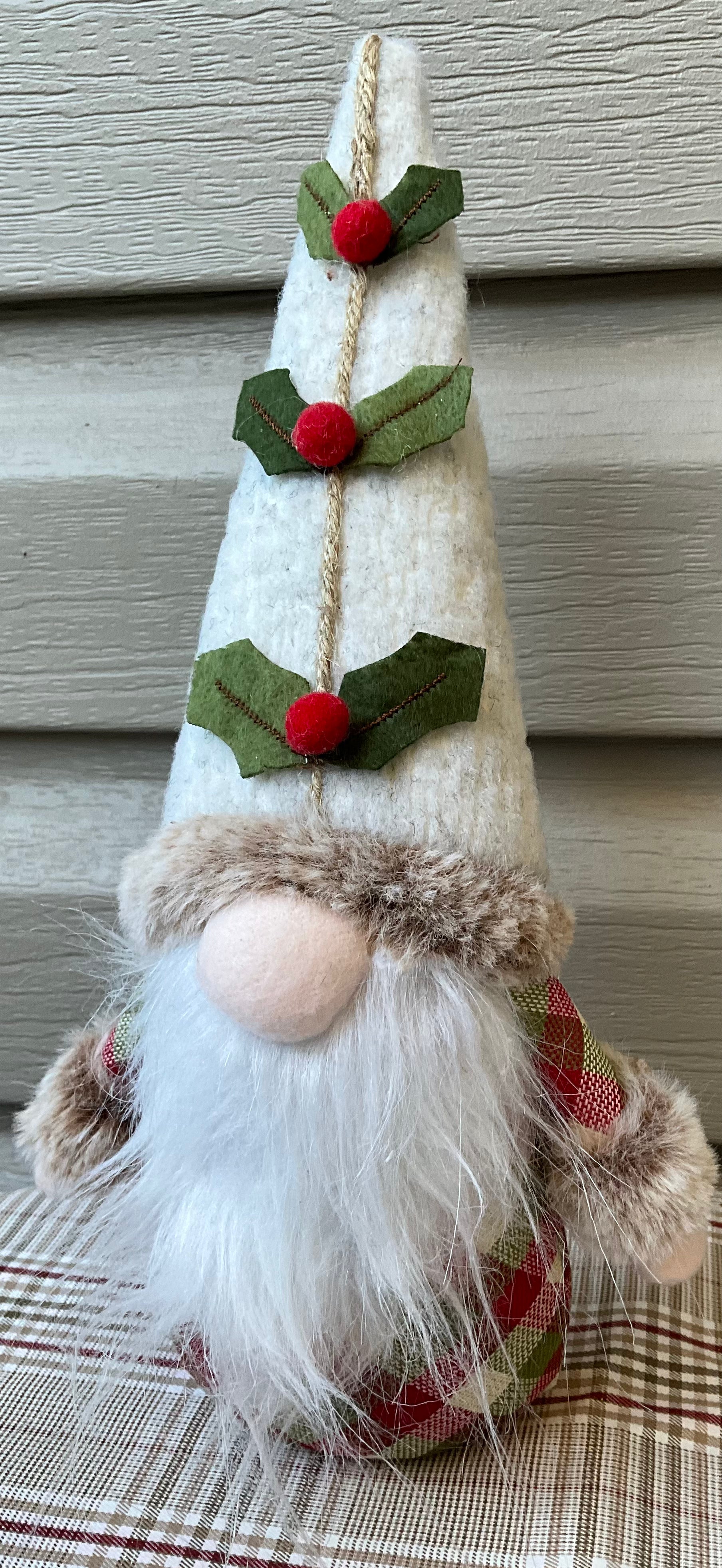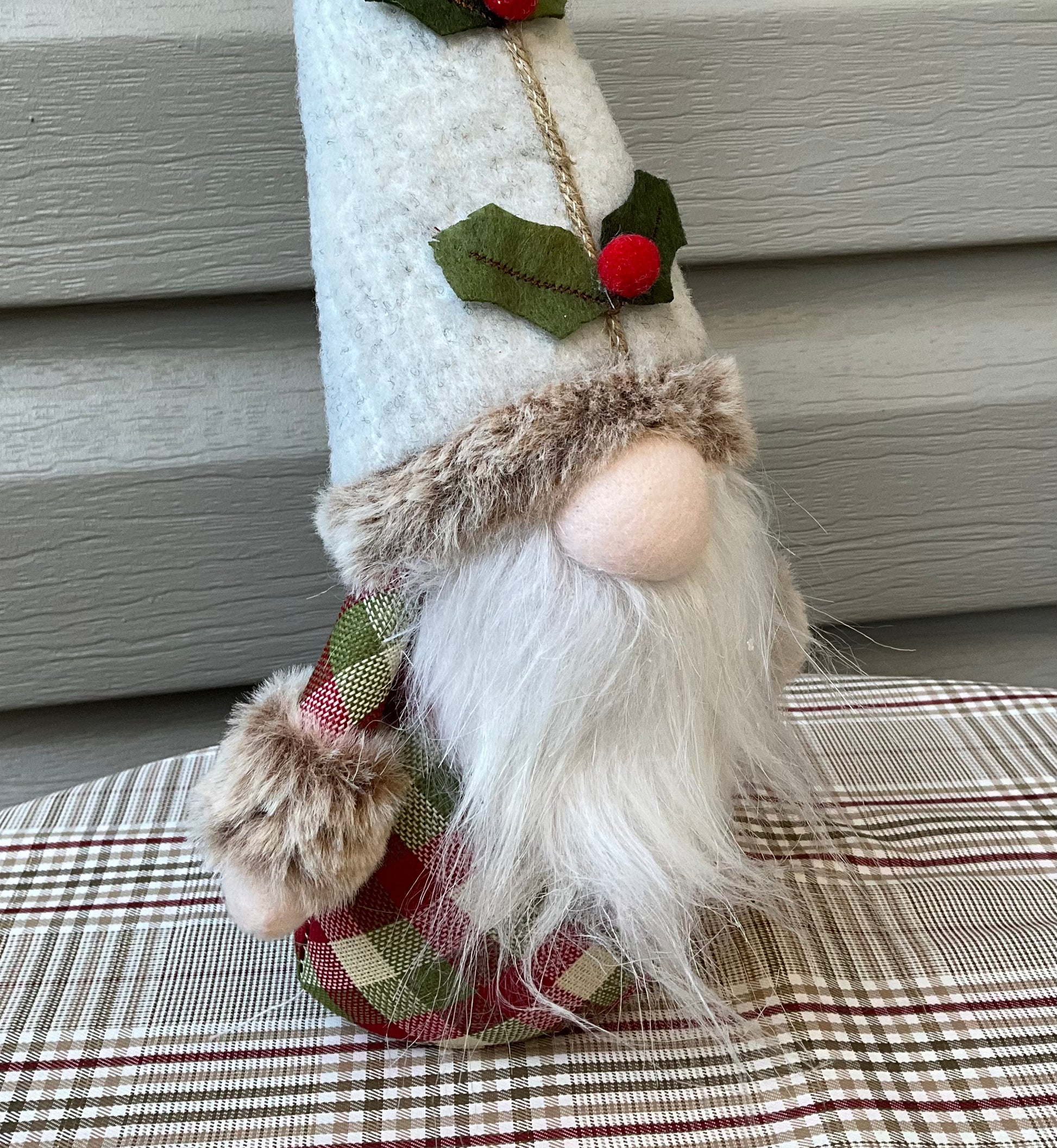 Cute traditional gnome with red, white and green check fabric body and large white beard.
