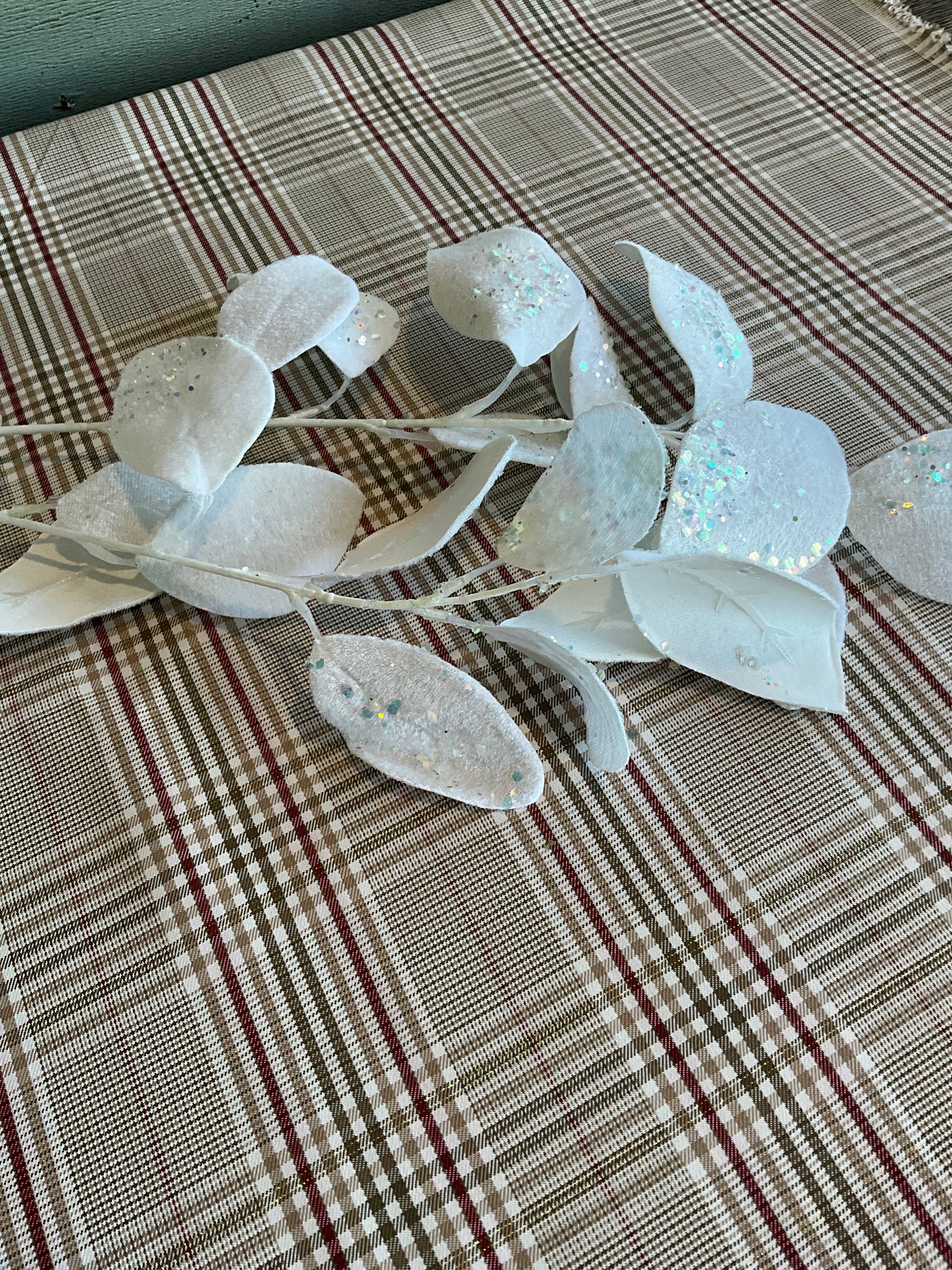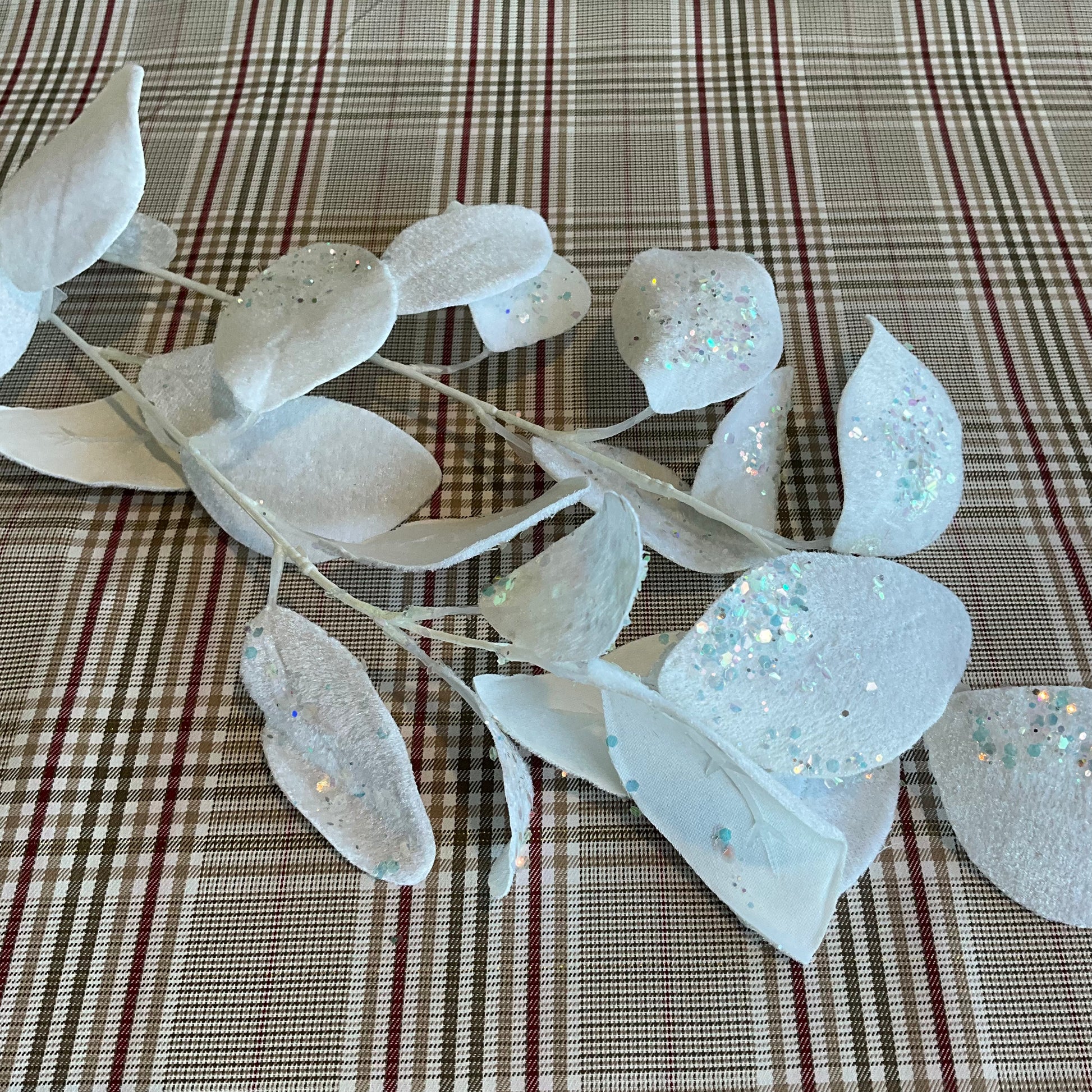 Beautiful luxurious white velvet eucalyptus spray. Dusting of glitter.