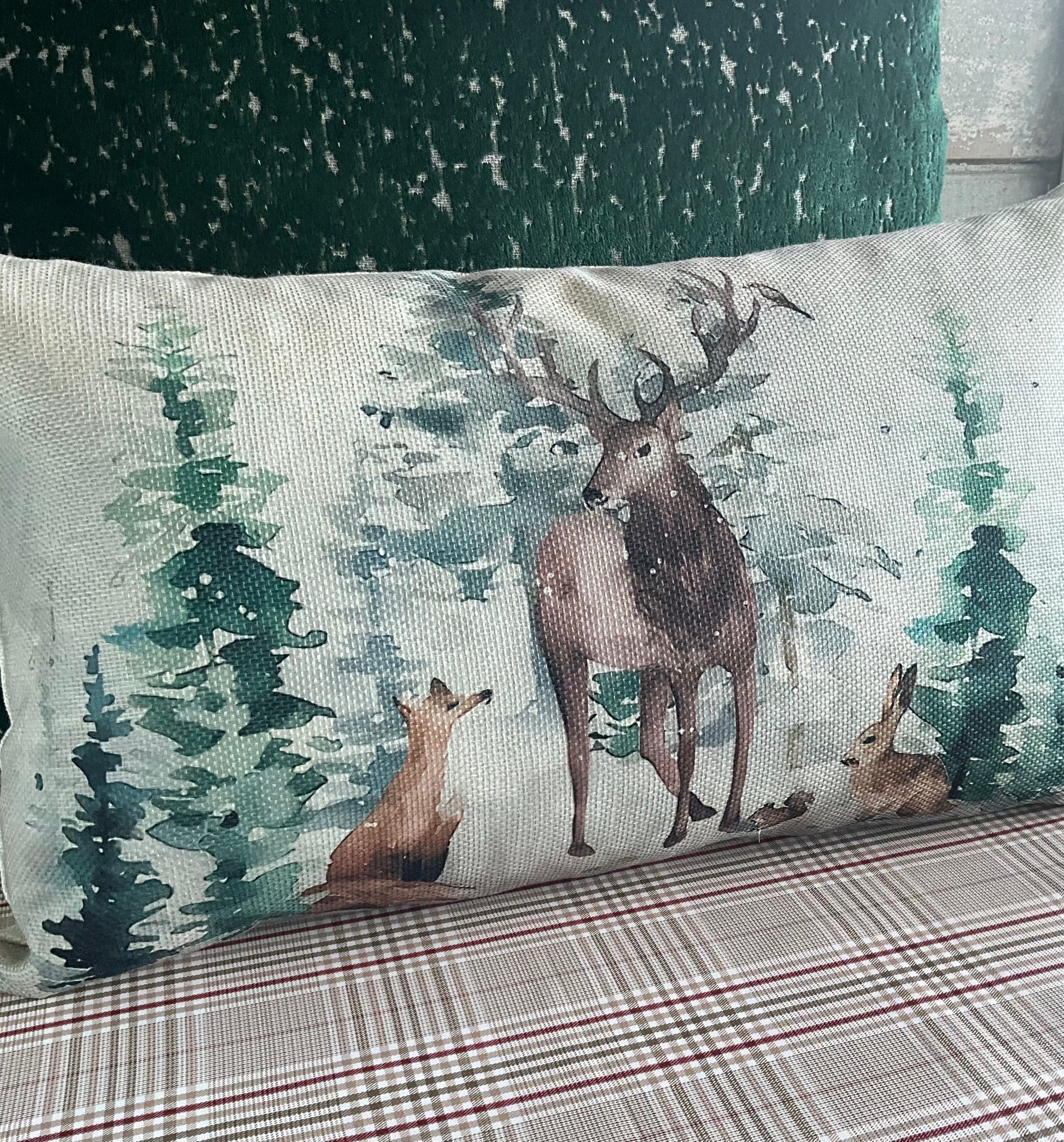 Rectangular-shaped pine tree and winter scene cushion cover featuring a deer, fox and rabbit. Soft watercolour design. Linen fabric. Pillow insert not included.
