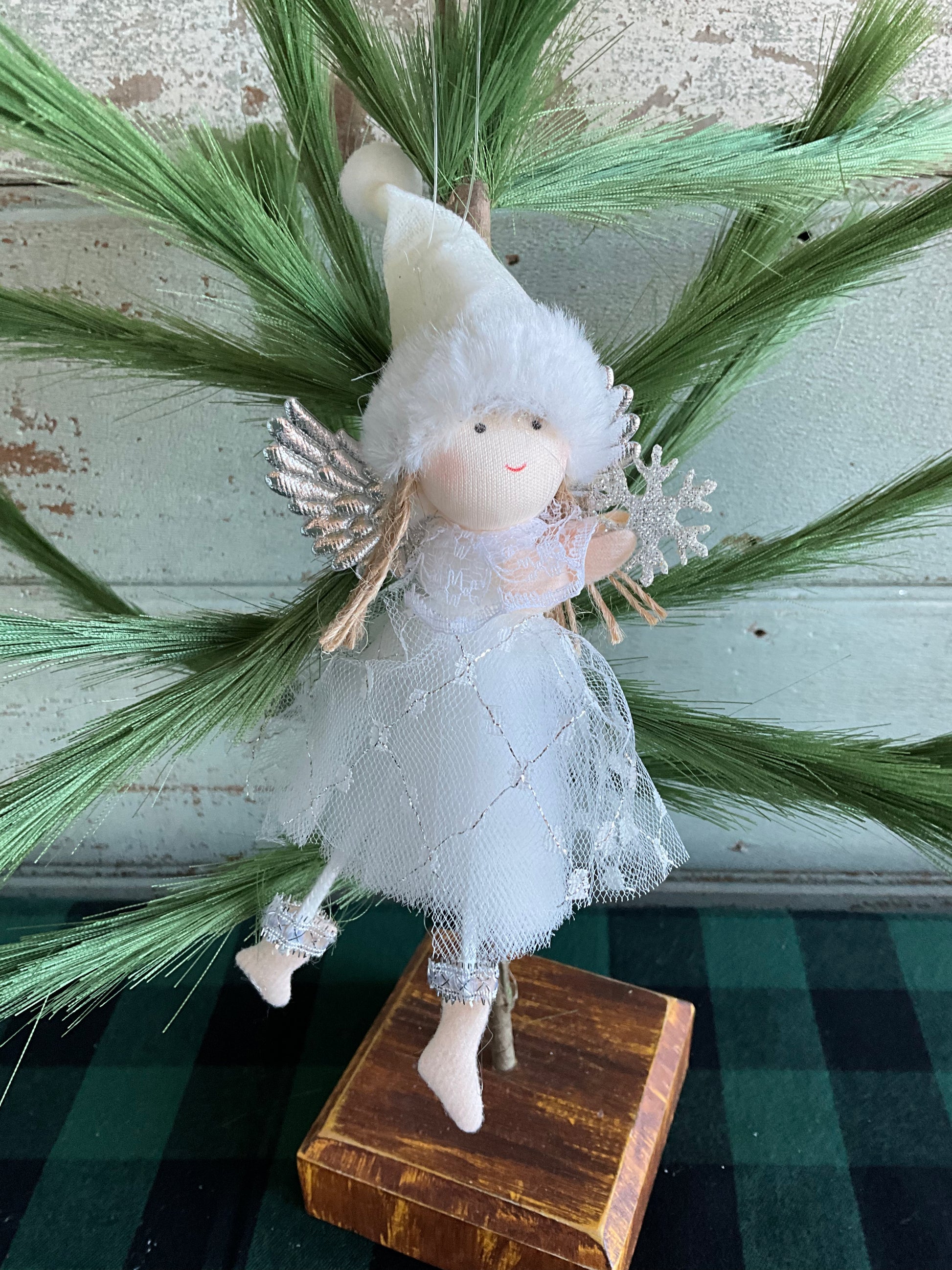 Pretty little winter snow Angel in white. Holds a snowflake in a tulle skirt.