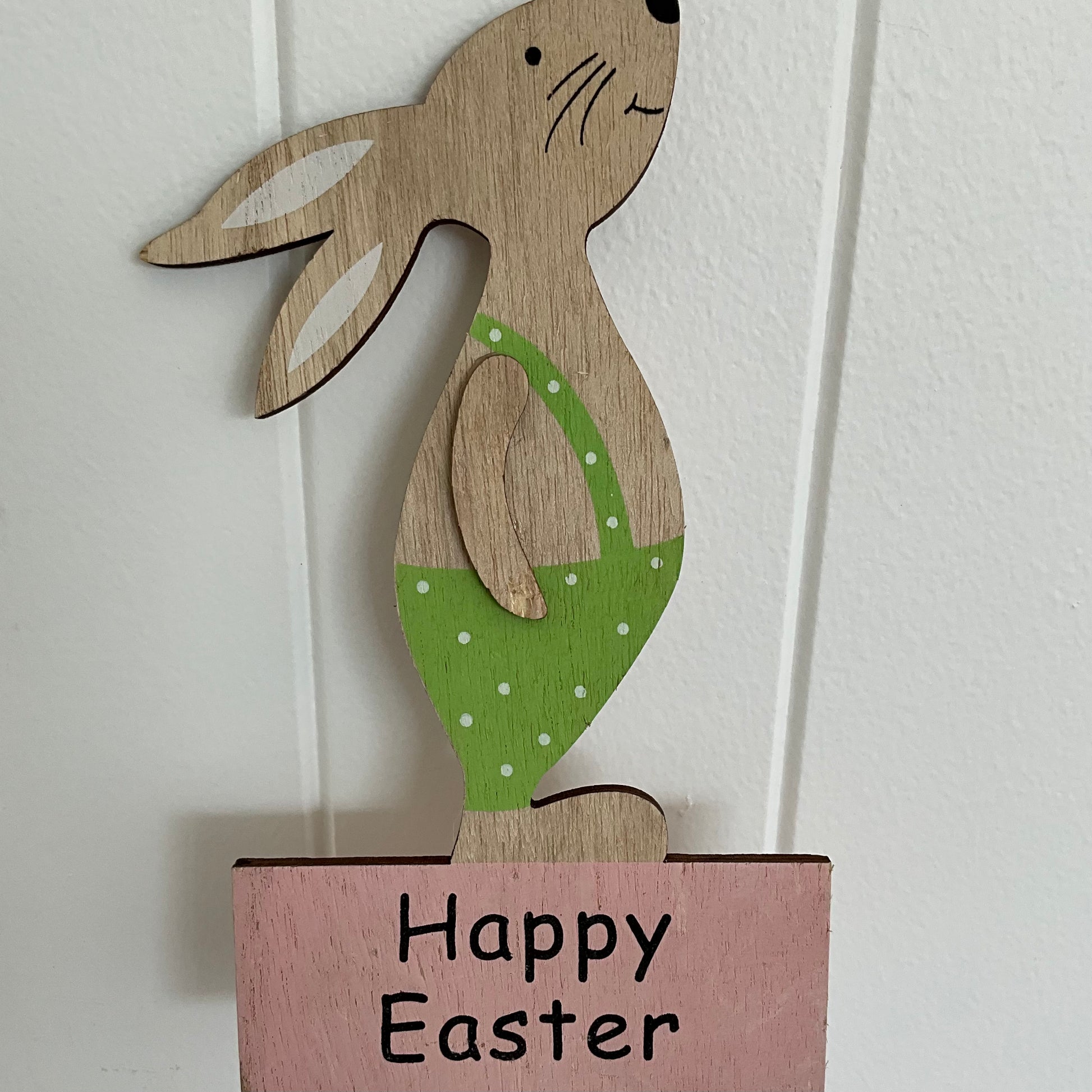 Painted Happy Easter wooden stake with a bunny. Green and pink.