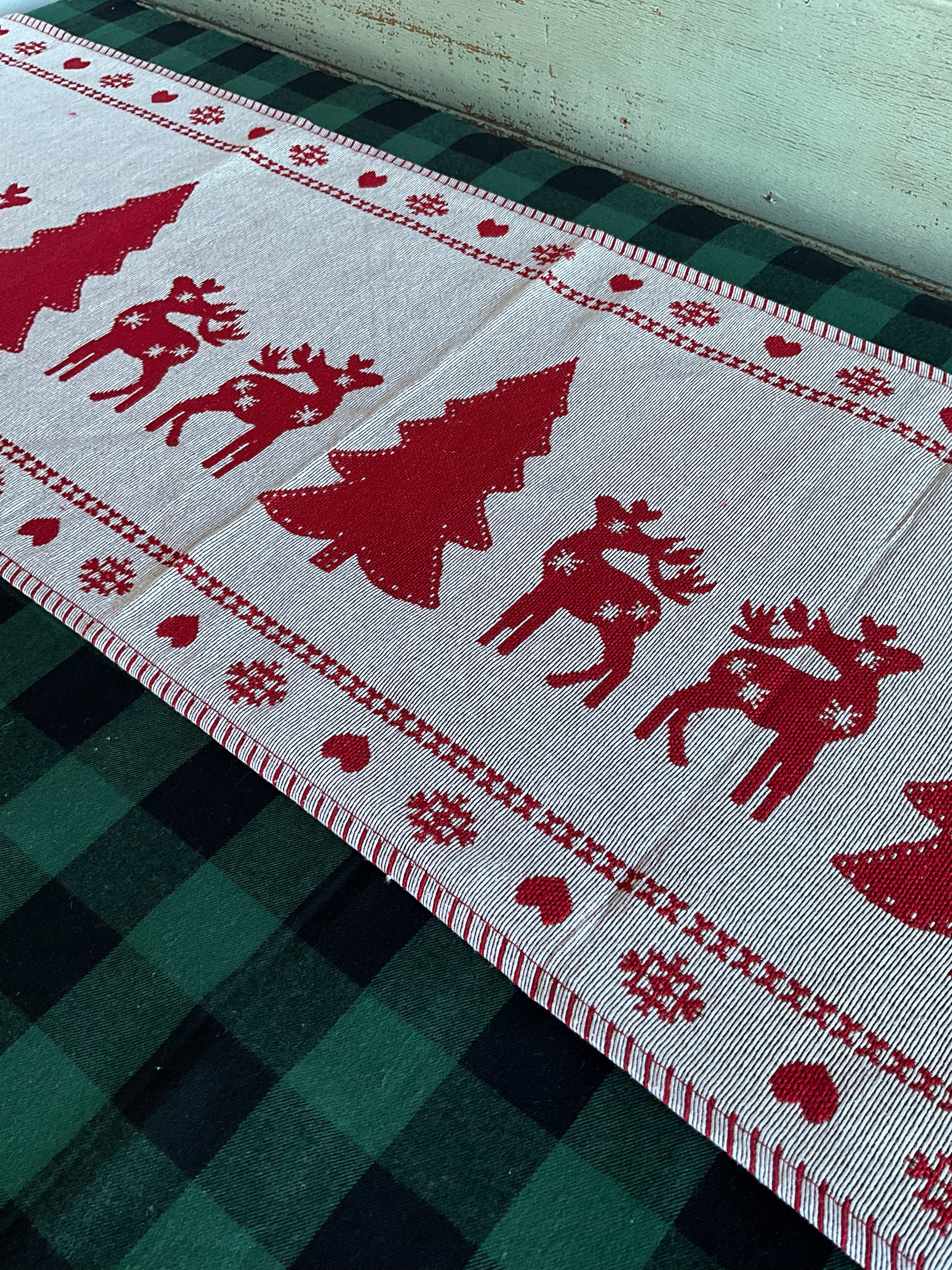 Red and soft white woven table runner with Christmas trees and reindeer designs. Red tassels at each end. Heart motive around the egdes.